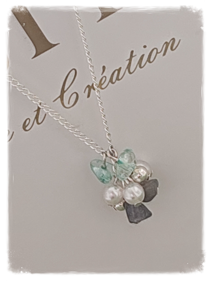 Pierre verte et grise transparente, petite perle en verre renaissance blanche, intercalaire,chêne en acier, 78 cm.