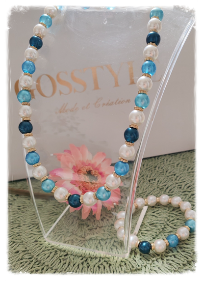 Collier ras de cou 50 cm + bracelet 20 cm, perle en verre renaissance blanche , perle en verre renaissance mi-transparente trois bleus, intercalaire, élastique.