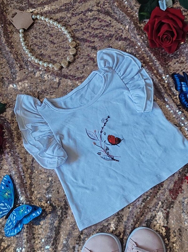 Tee-shirt fille col rond,manche courte volant superposé 62% Polyester 34% coton 4% Elesthanne