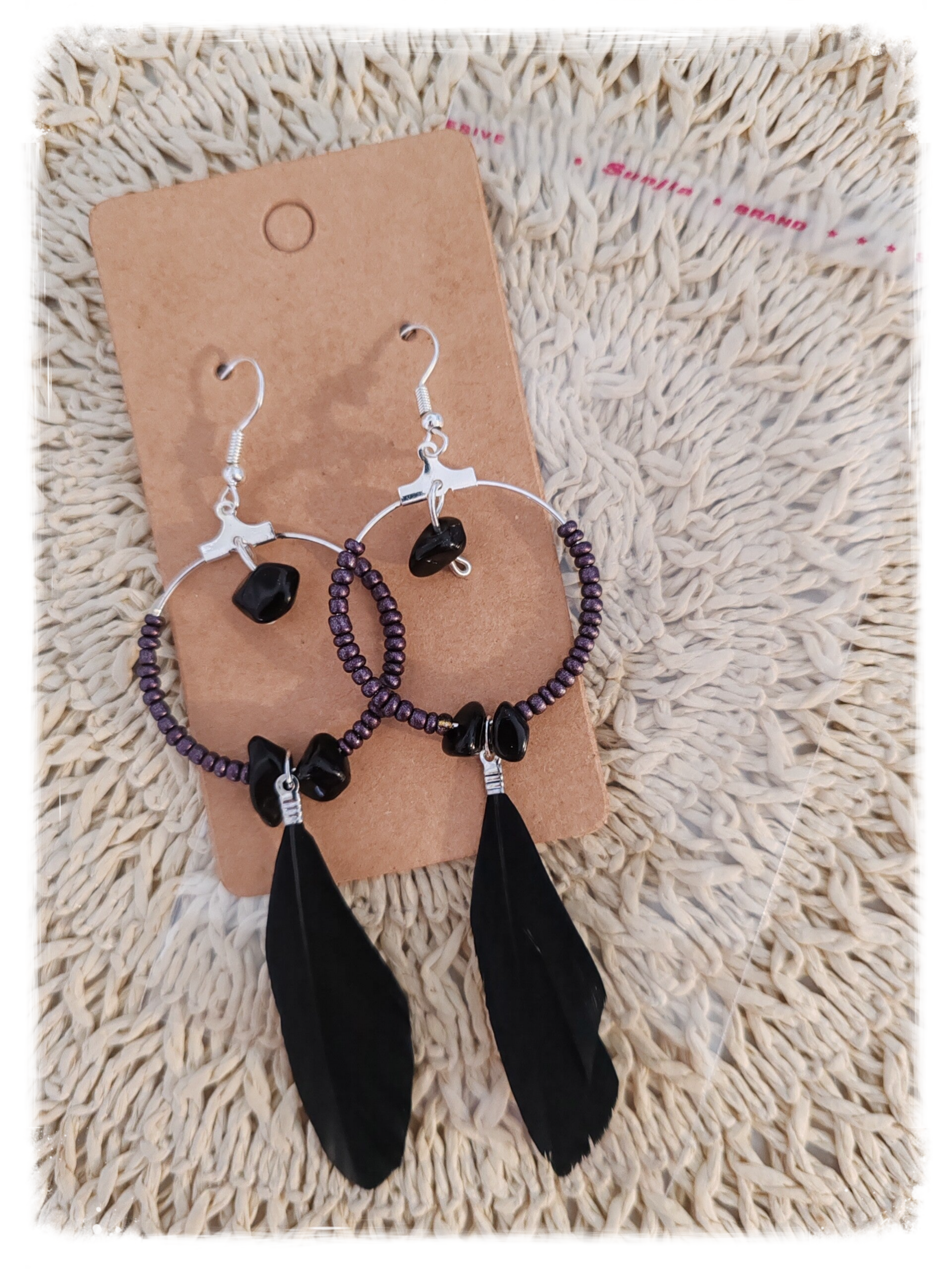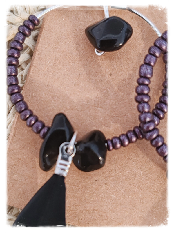 Pierre noir, petite perle voilette, plume noir