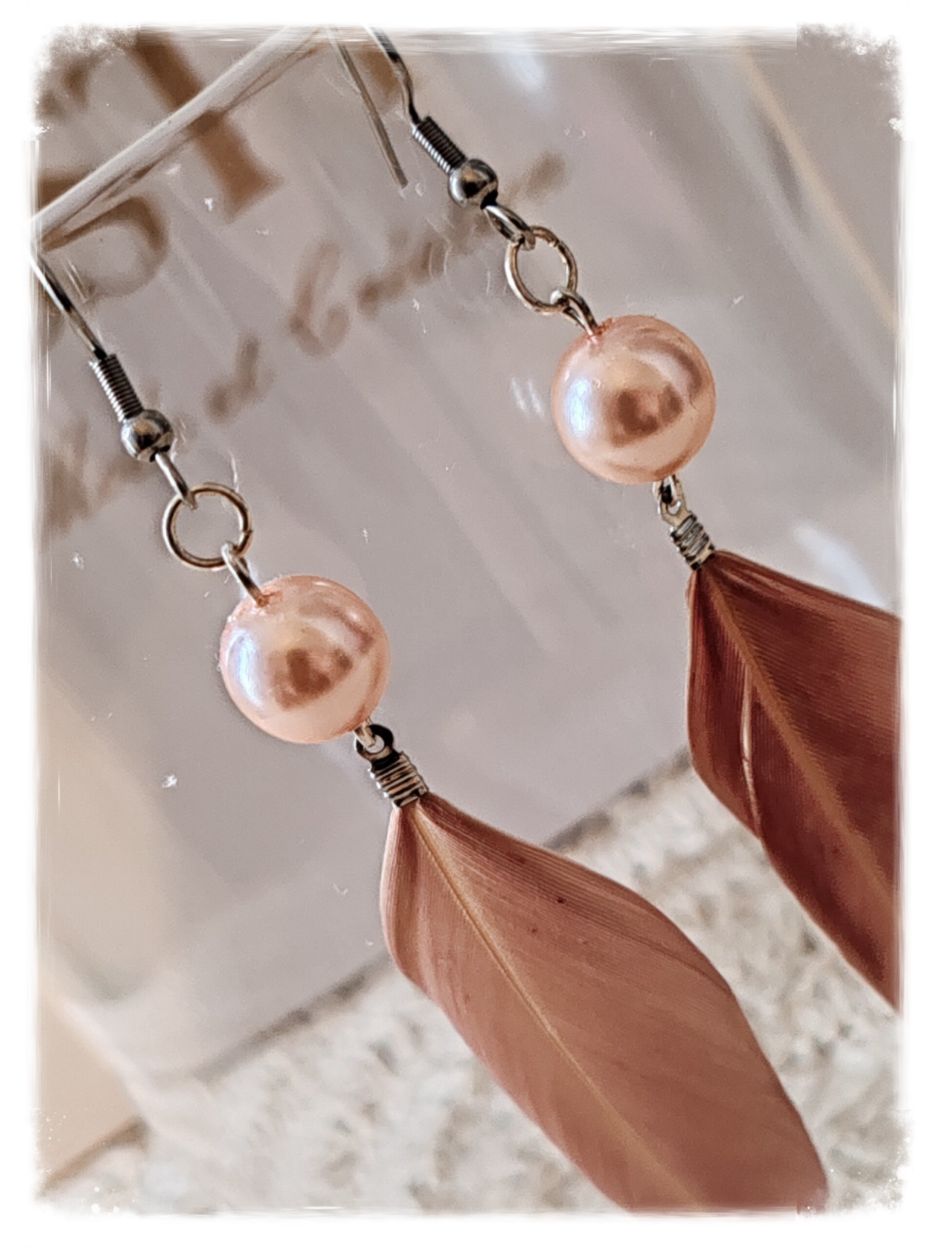 Perle en verre rose, plume rose parme