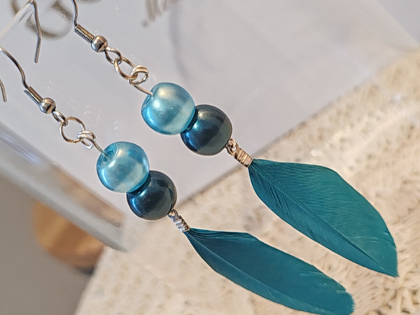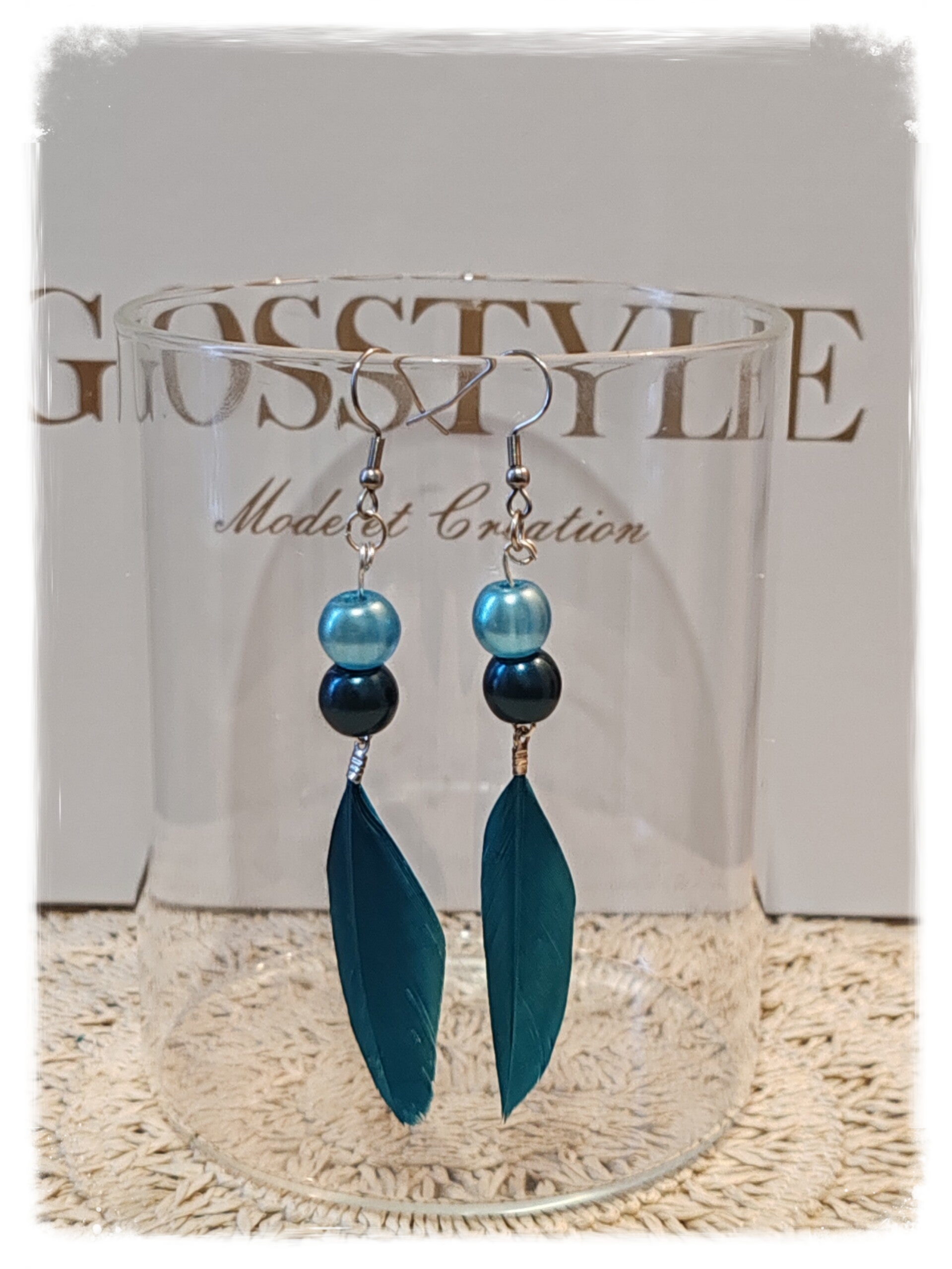 Perle en verre renaissance mi-transparente bleu clair et bleu foncé, plume bleu foncé