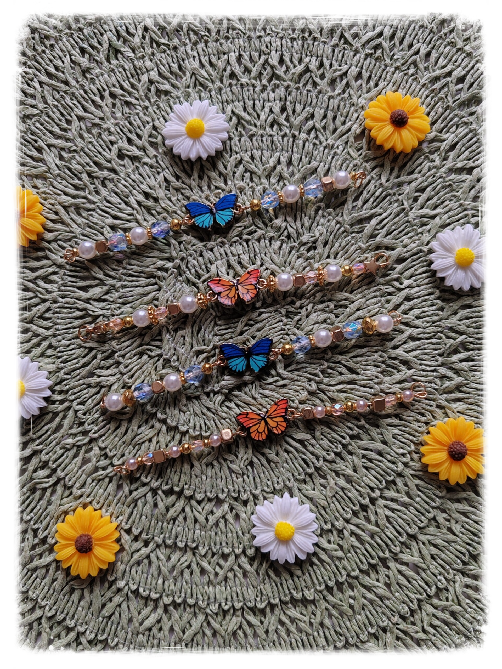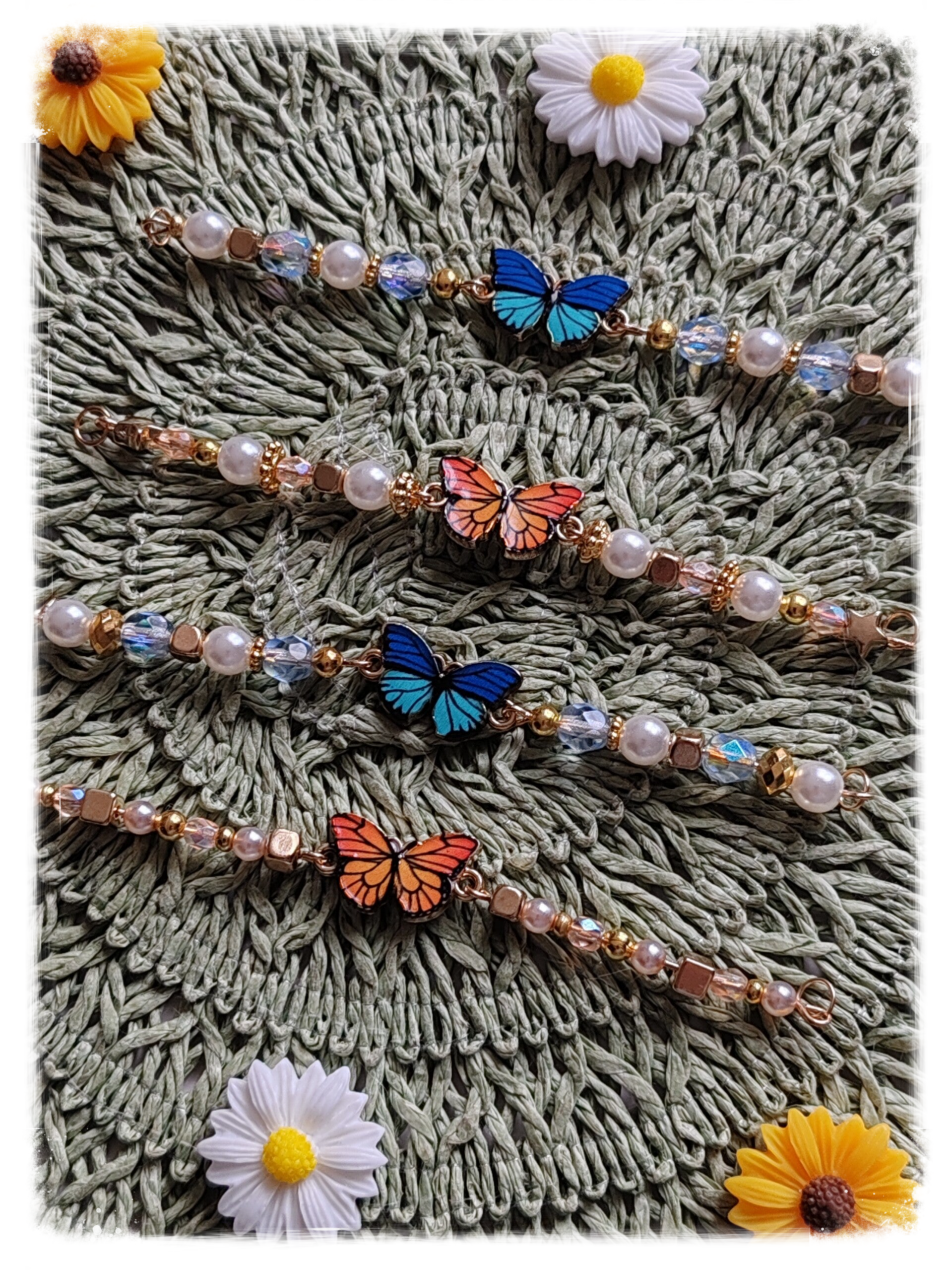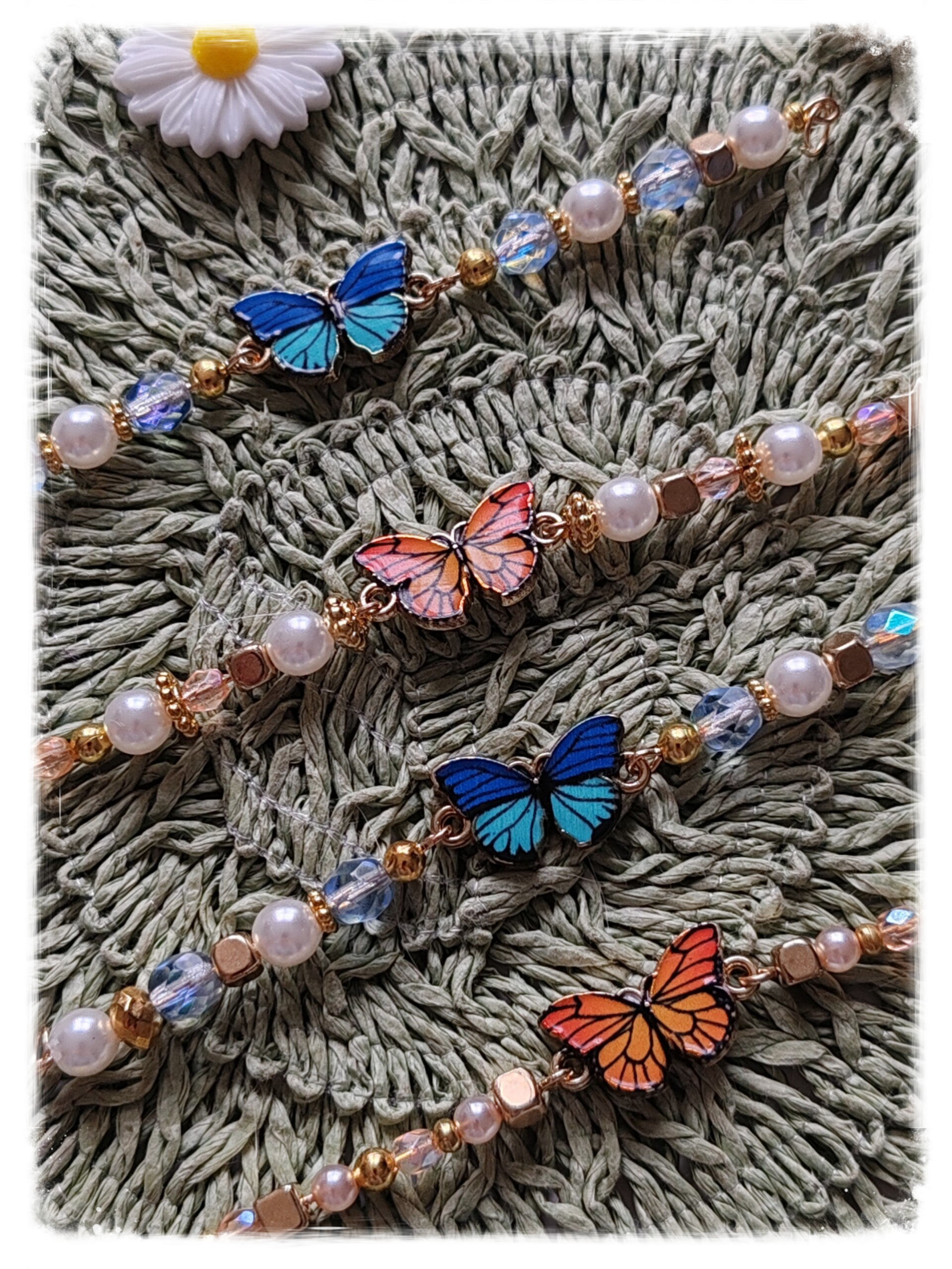 Papillon en alliage de zinc, mix doré, petite perle rose renaissance en verre, perles blanches renaissance en verre, perles facettée bleu et rose