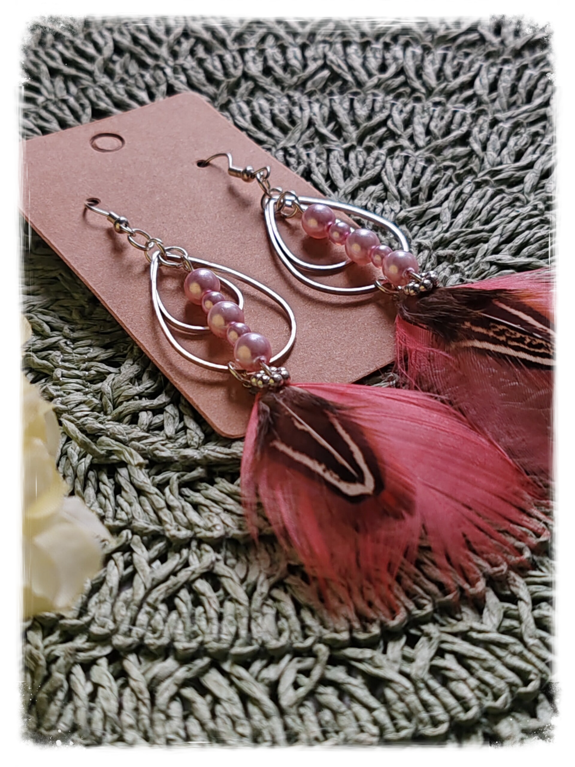 Petite perle renaissance en verre rose,et sa jolie plume