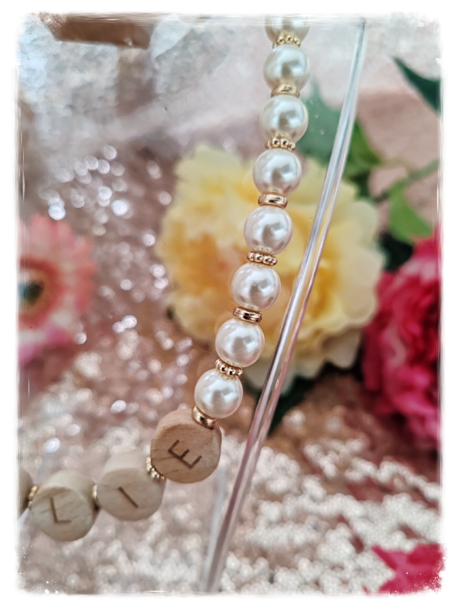 Grosse perle en verre écru, perles en bois, intercalaire, élastique