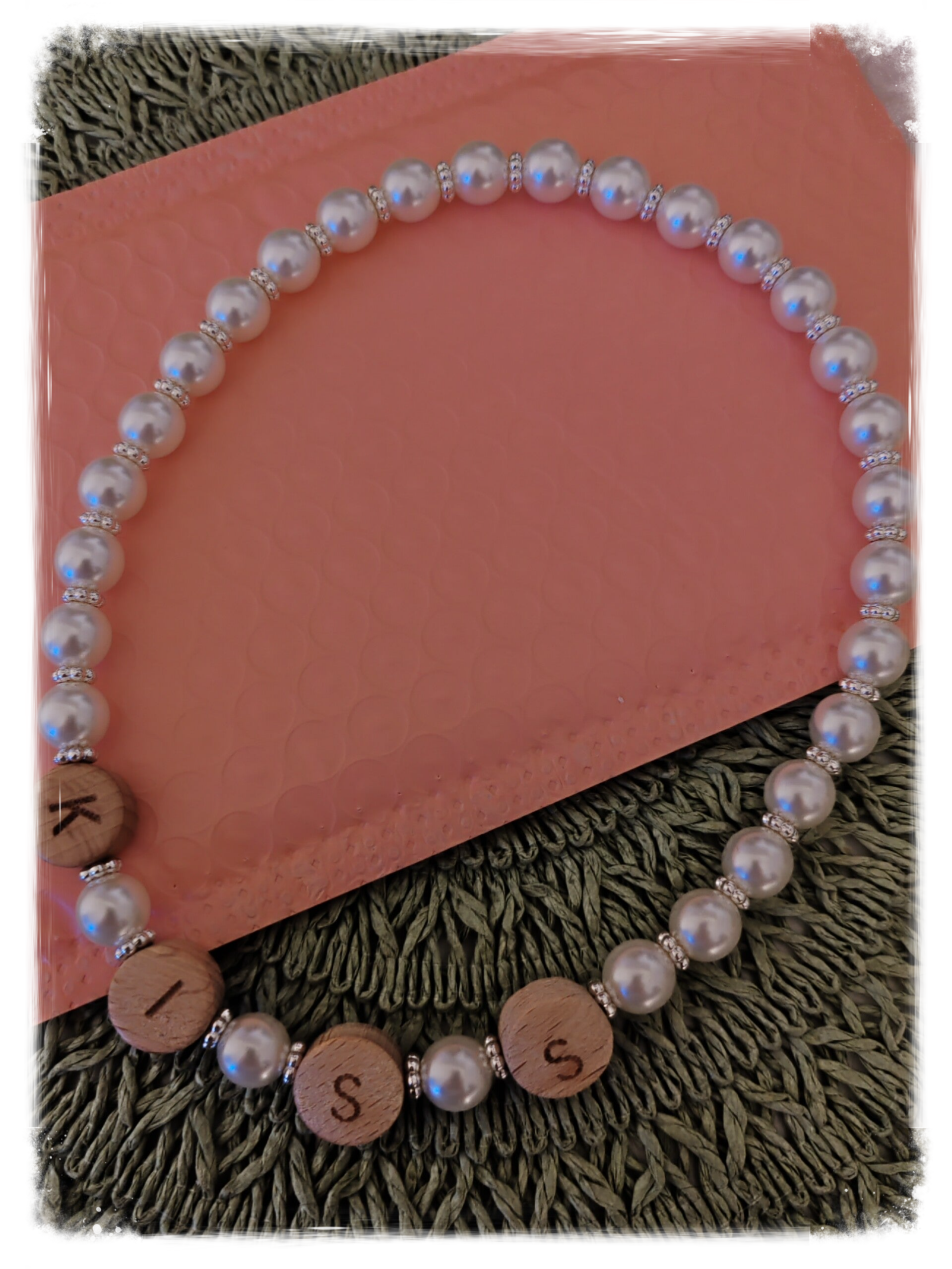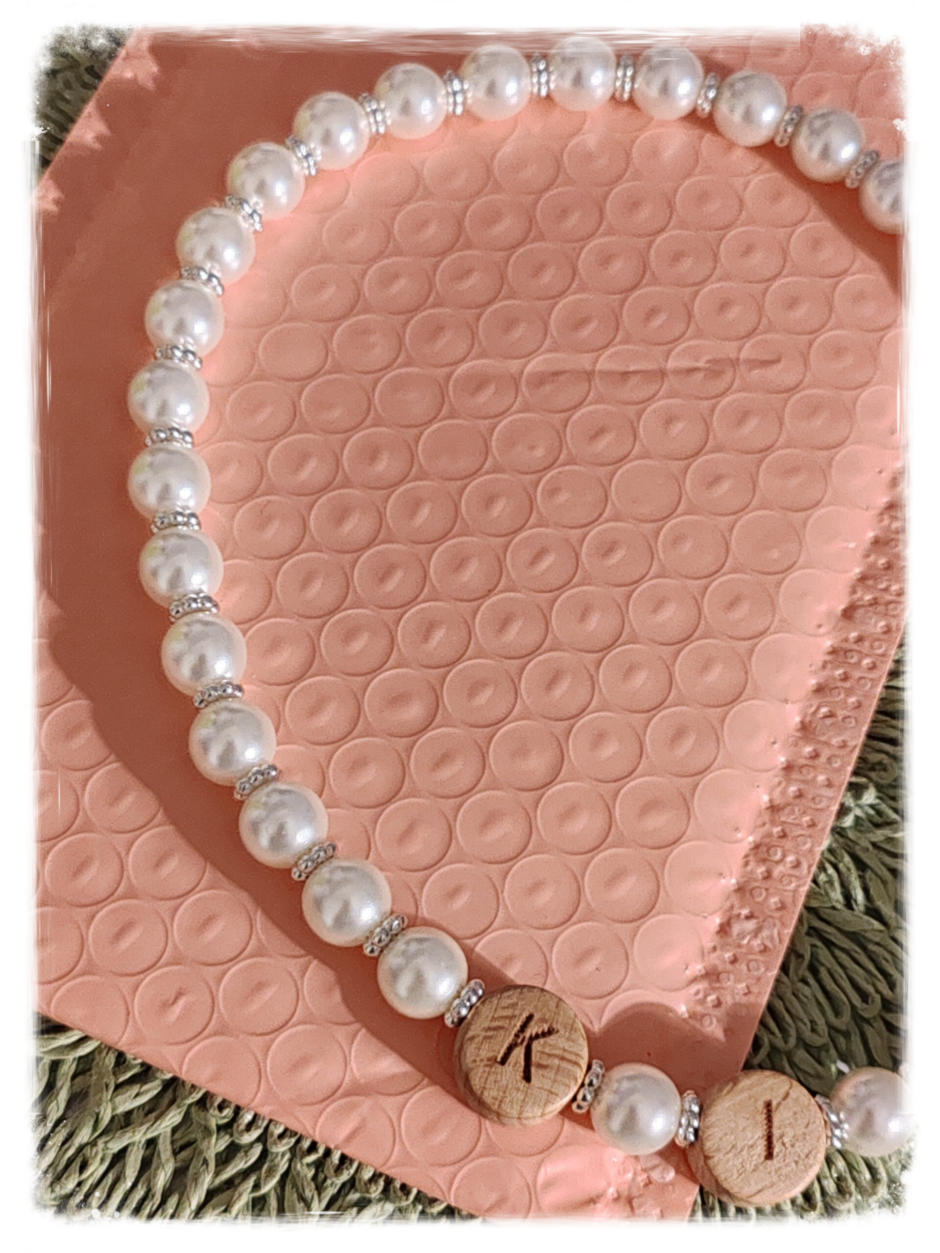 Perle en verre blanche, perles en bois, élastique, intercalaire