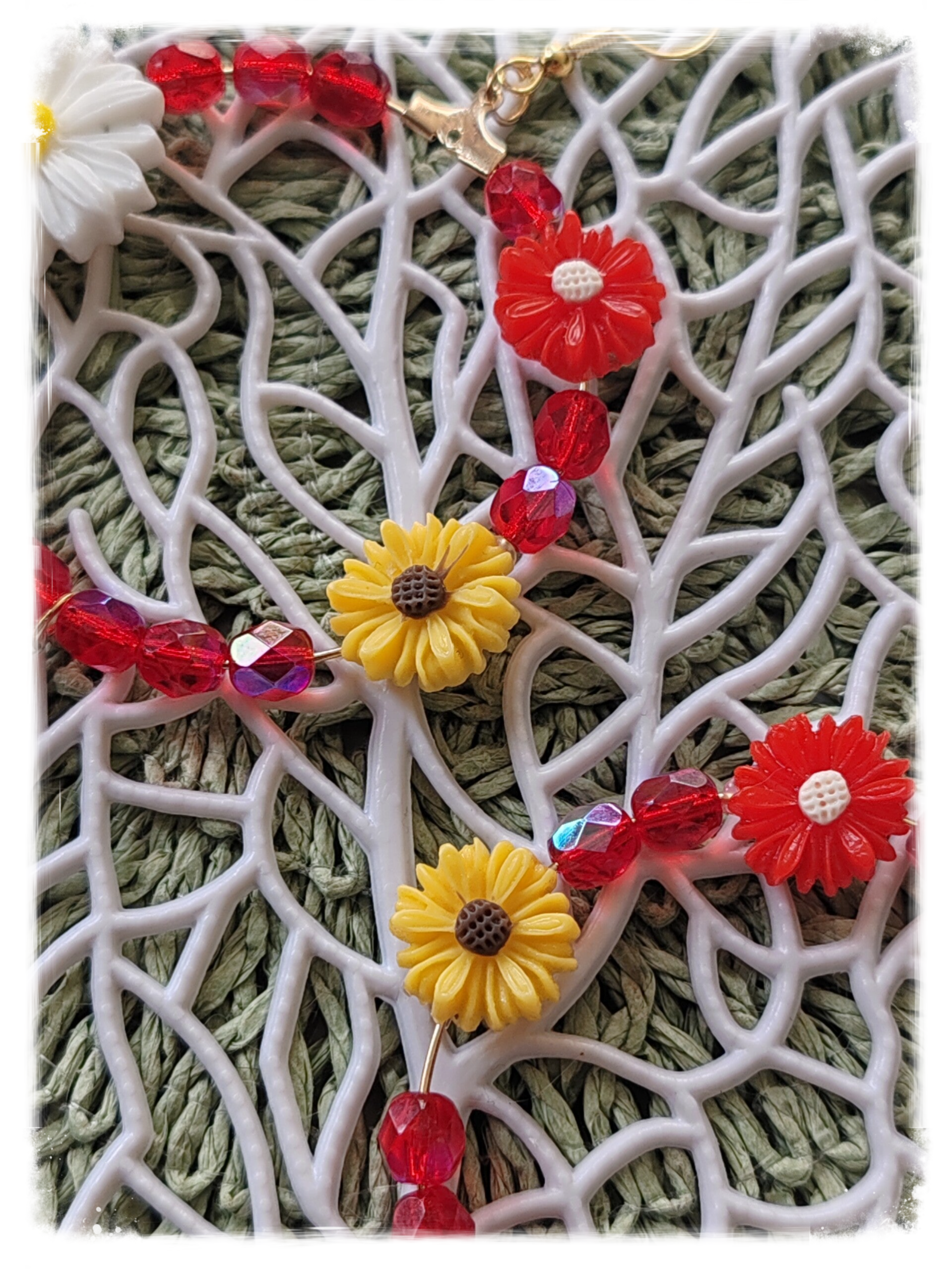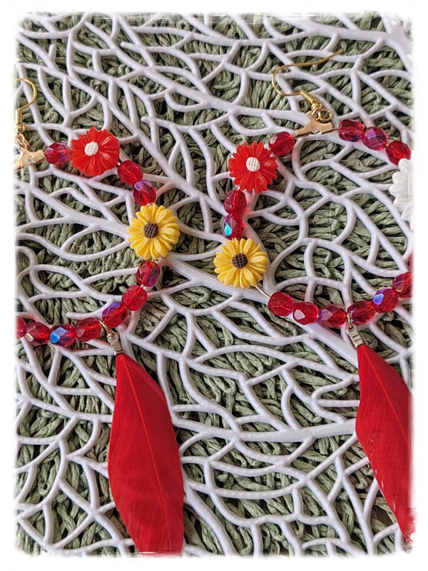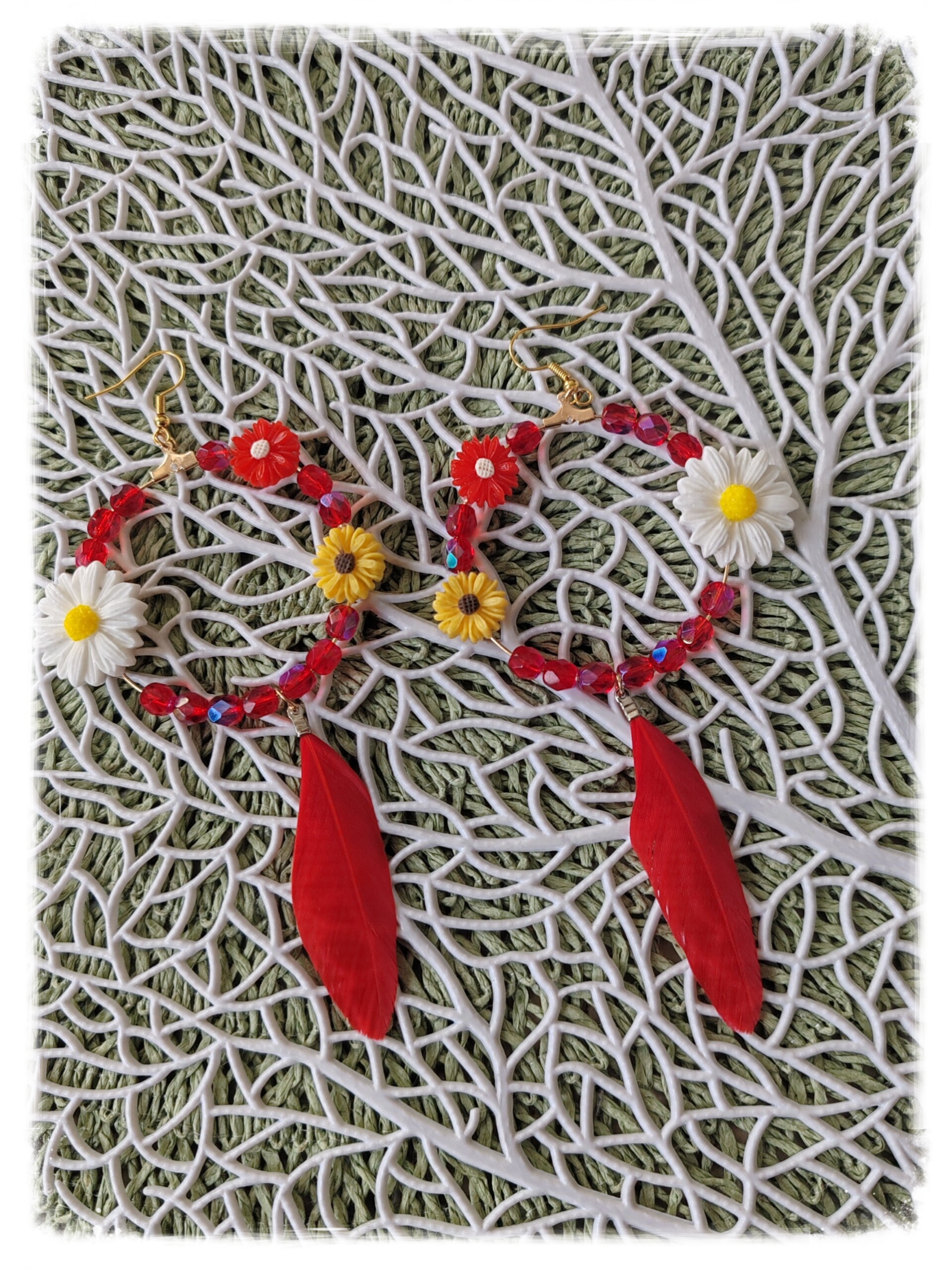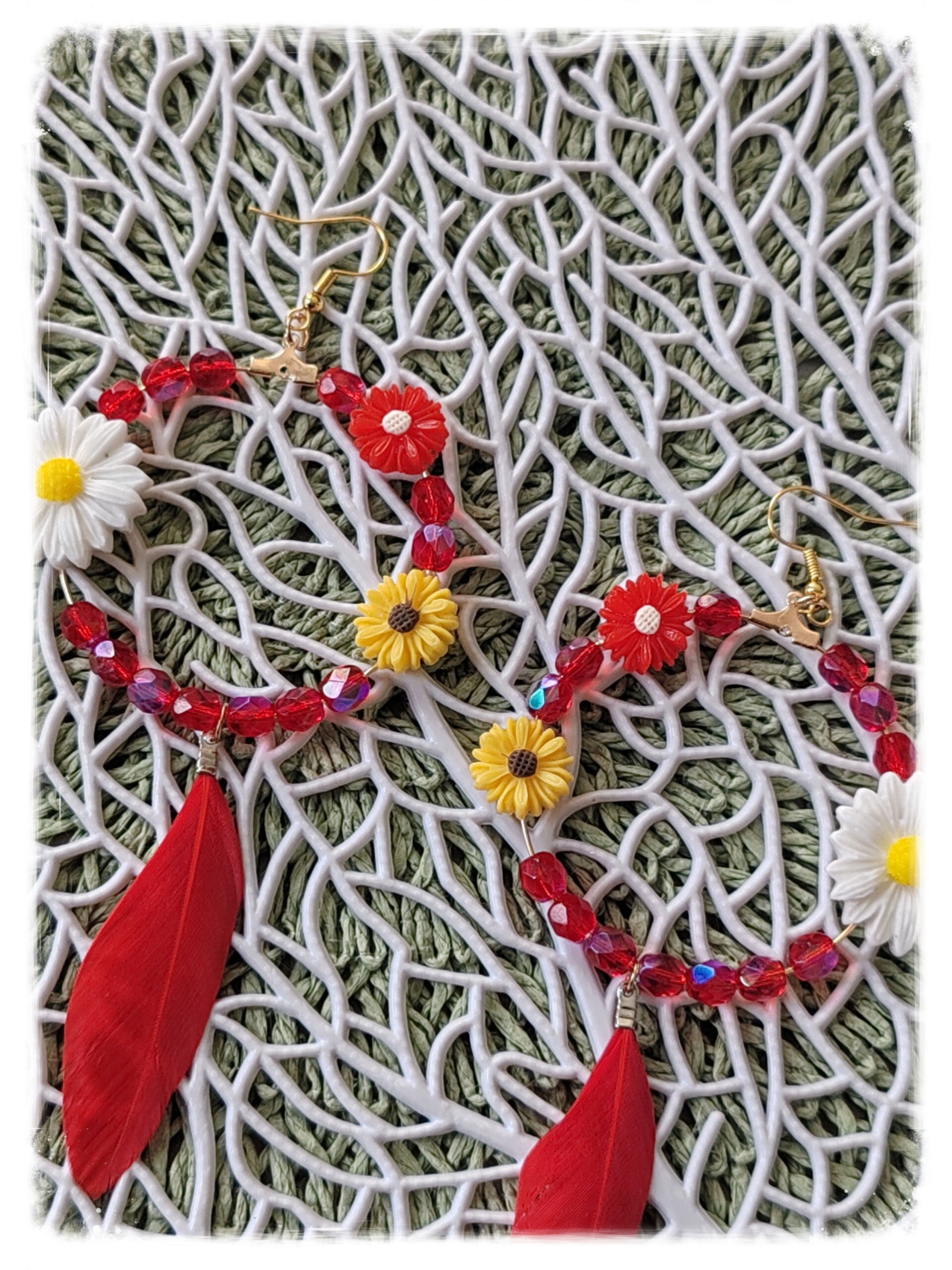 En acier inoxydable, acier, perles facettée rouge, fleurs en résine, plume rouge.