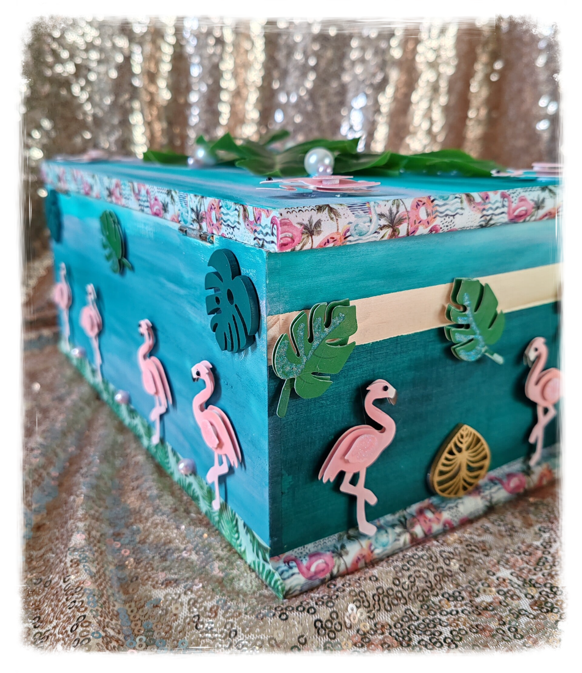 Boîte en bois, longueur :29 cm, Largeur :17,5 cm, hauteur :14 cm,peinte à la main, bois feuille artificielle, perle en verre renaissance blanche et rose.