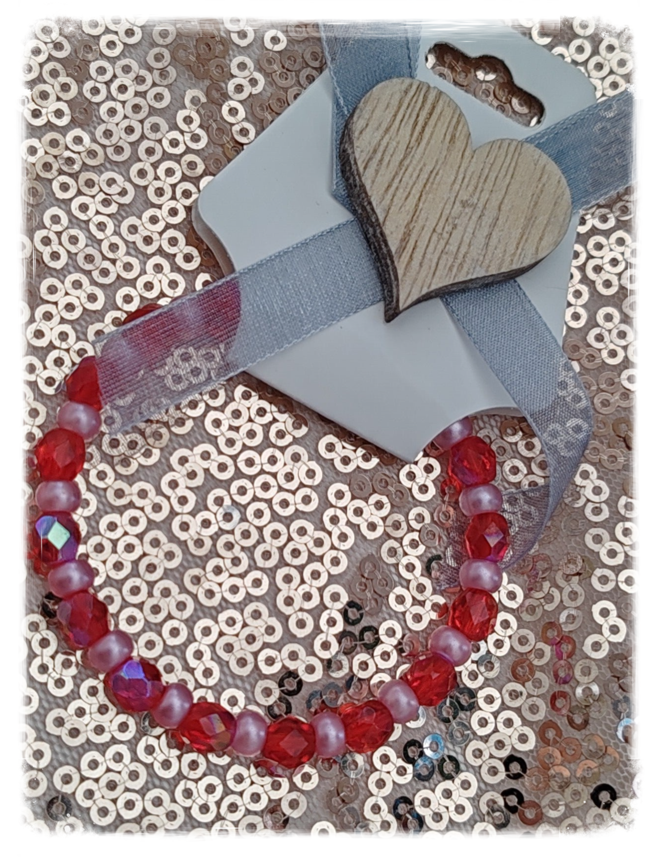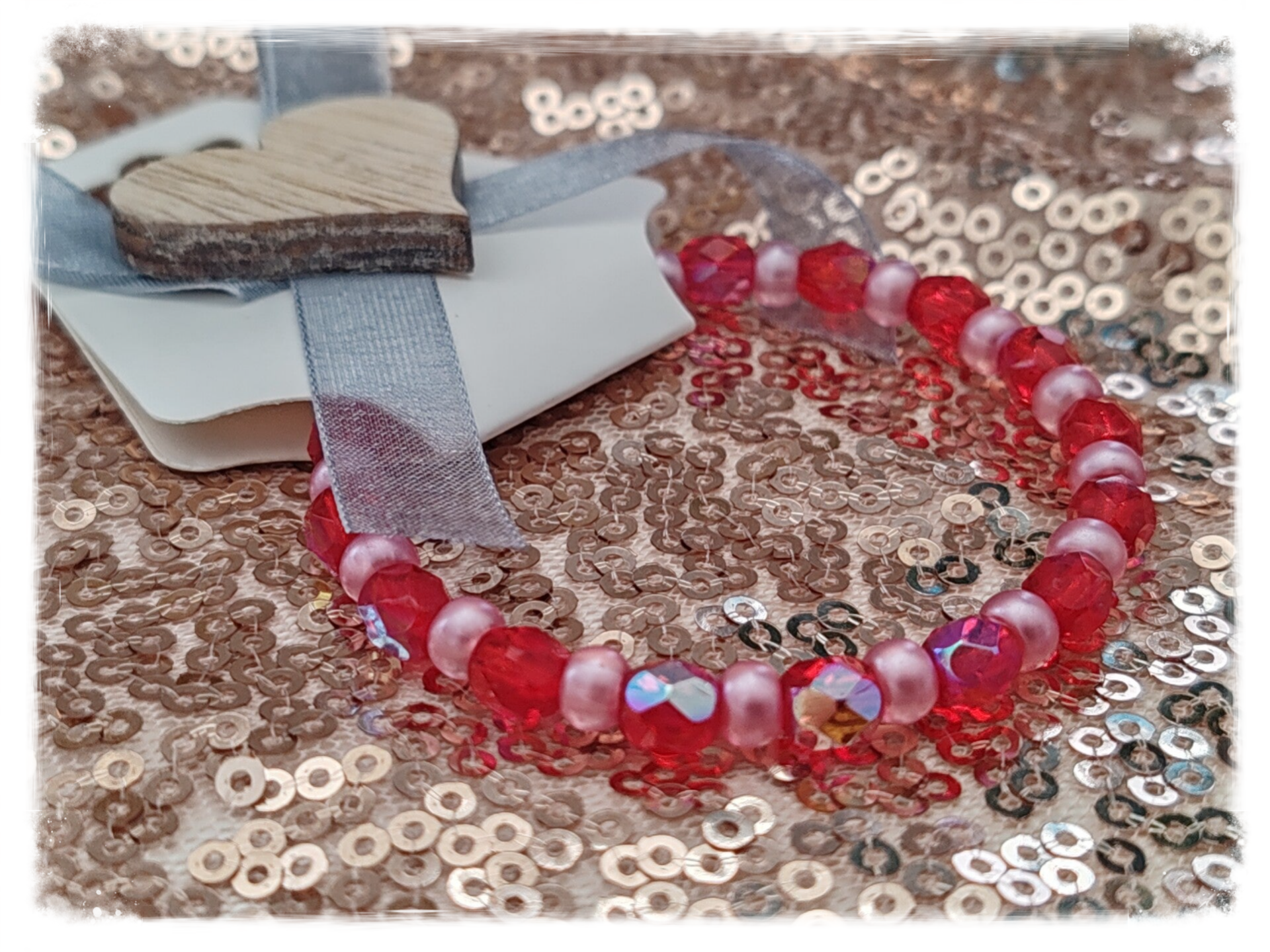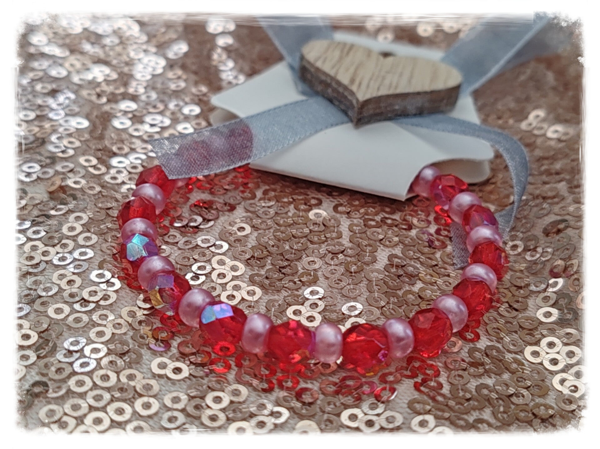 Perle rocaille rose, perle facettée rouge, élastique.