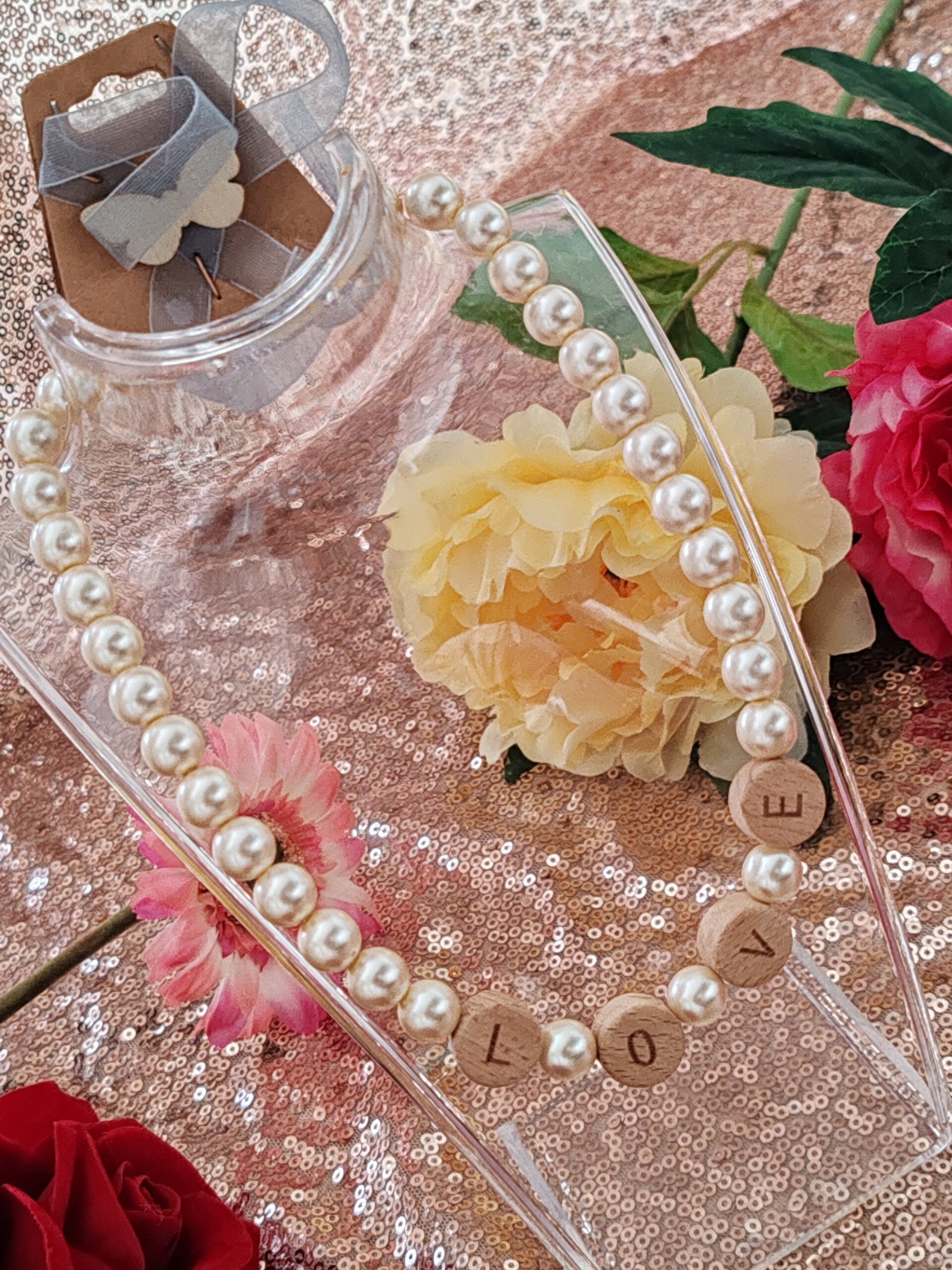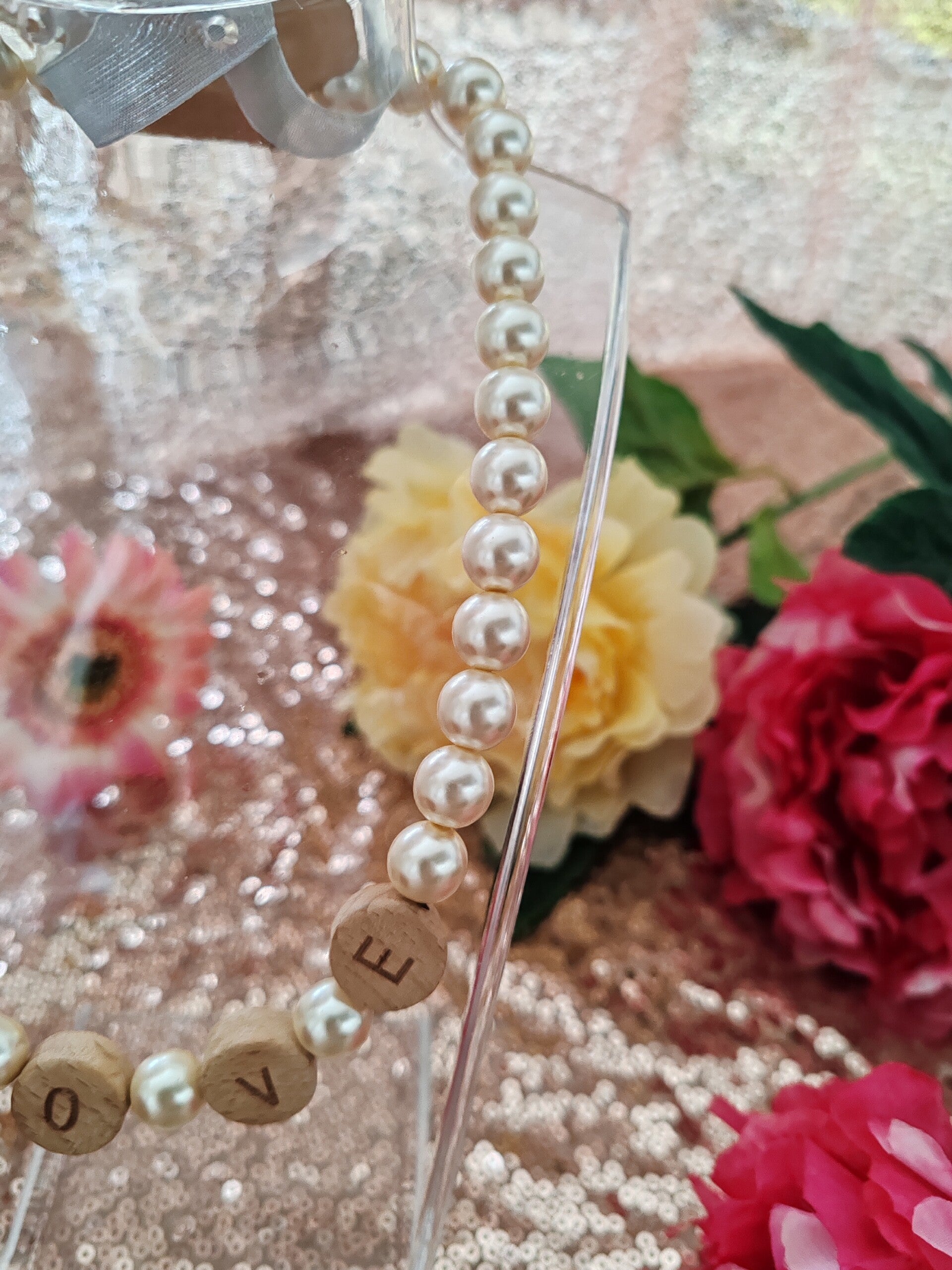 Grosse perle en verre écru, perle lettre en bois,élastique.