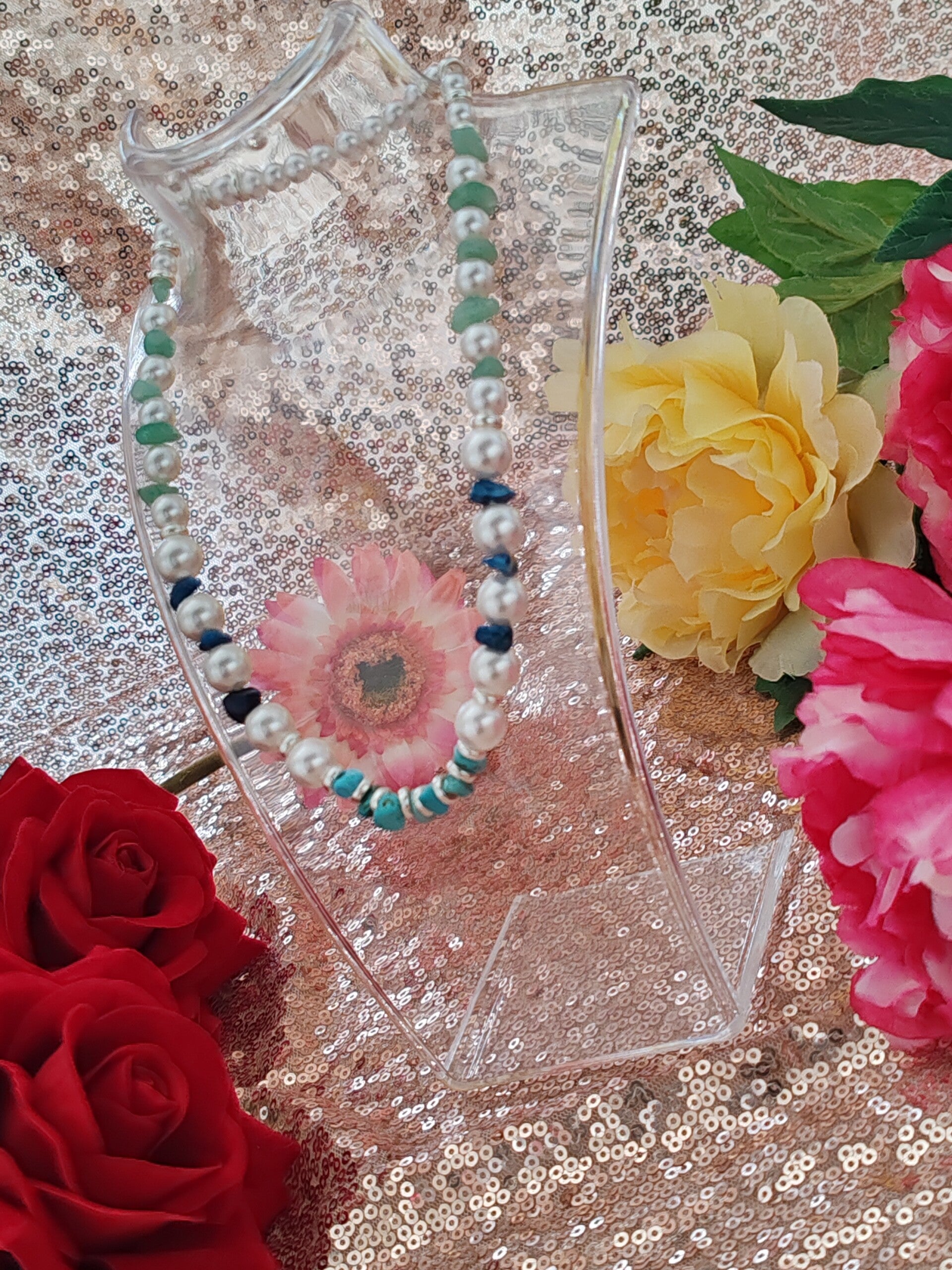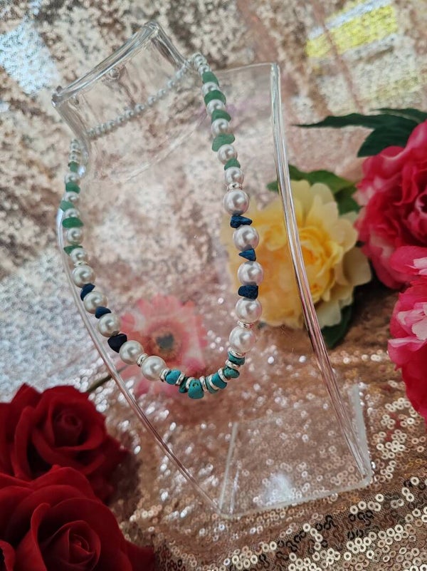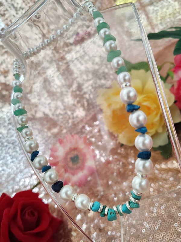 Perle grosse, moyenne et petite en verre renaissance blanche, intercalaire, pierre vert bleu foncé, turquoise,élastique.