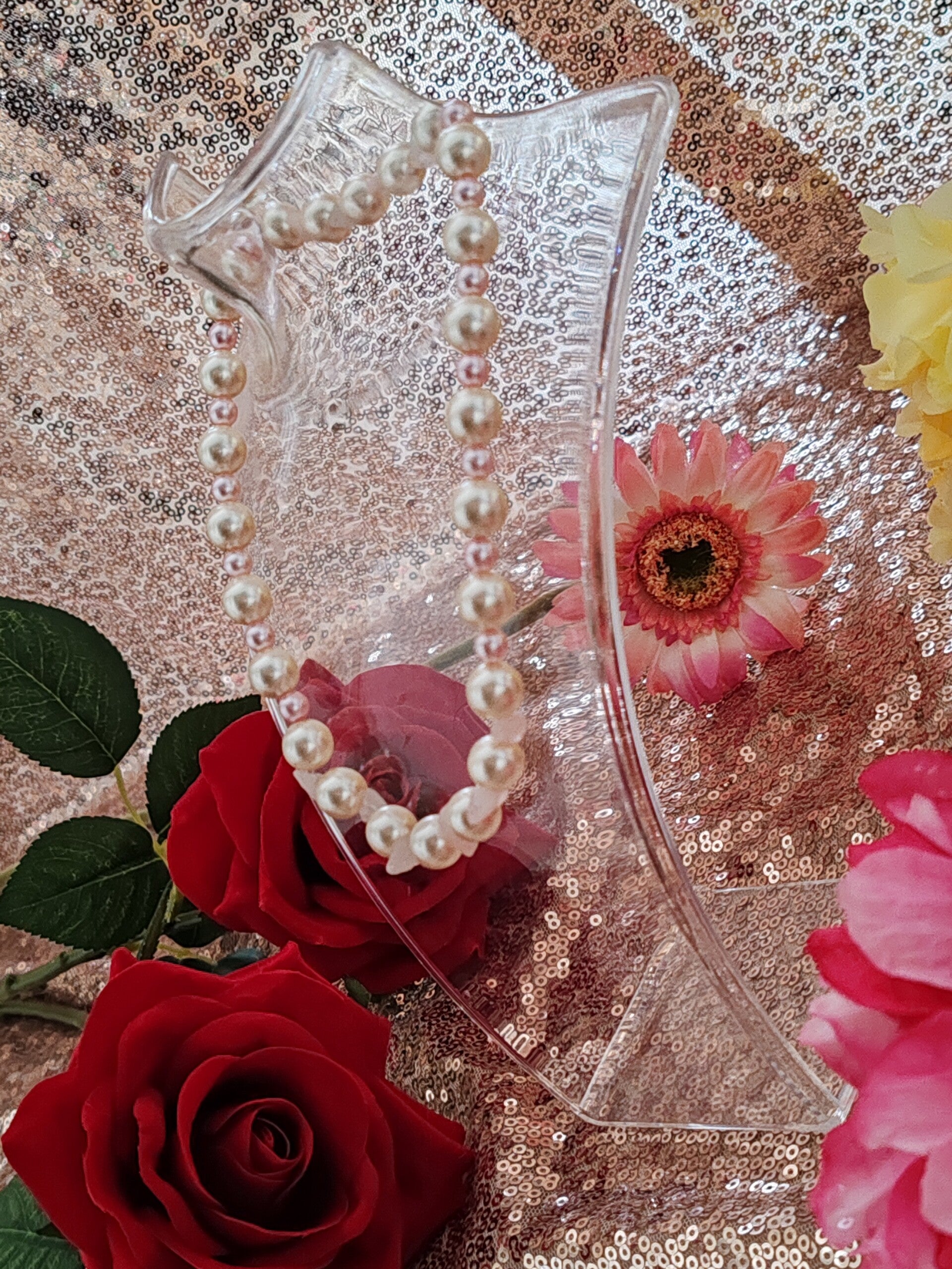 Grosse perle en verre renaissance écru, petite perle rose renaissance en verre, pierre transparente rose, élastique.
