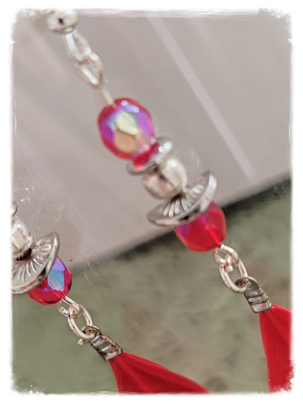 Perle facetté rouge, intercalaire, plume rouge, en acier inoxydable et acier.