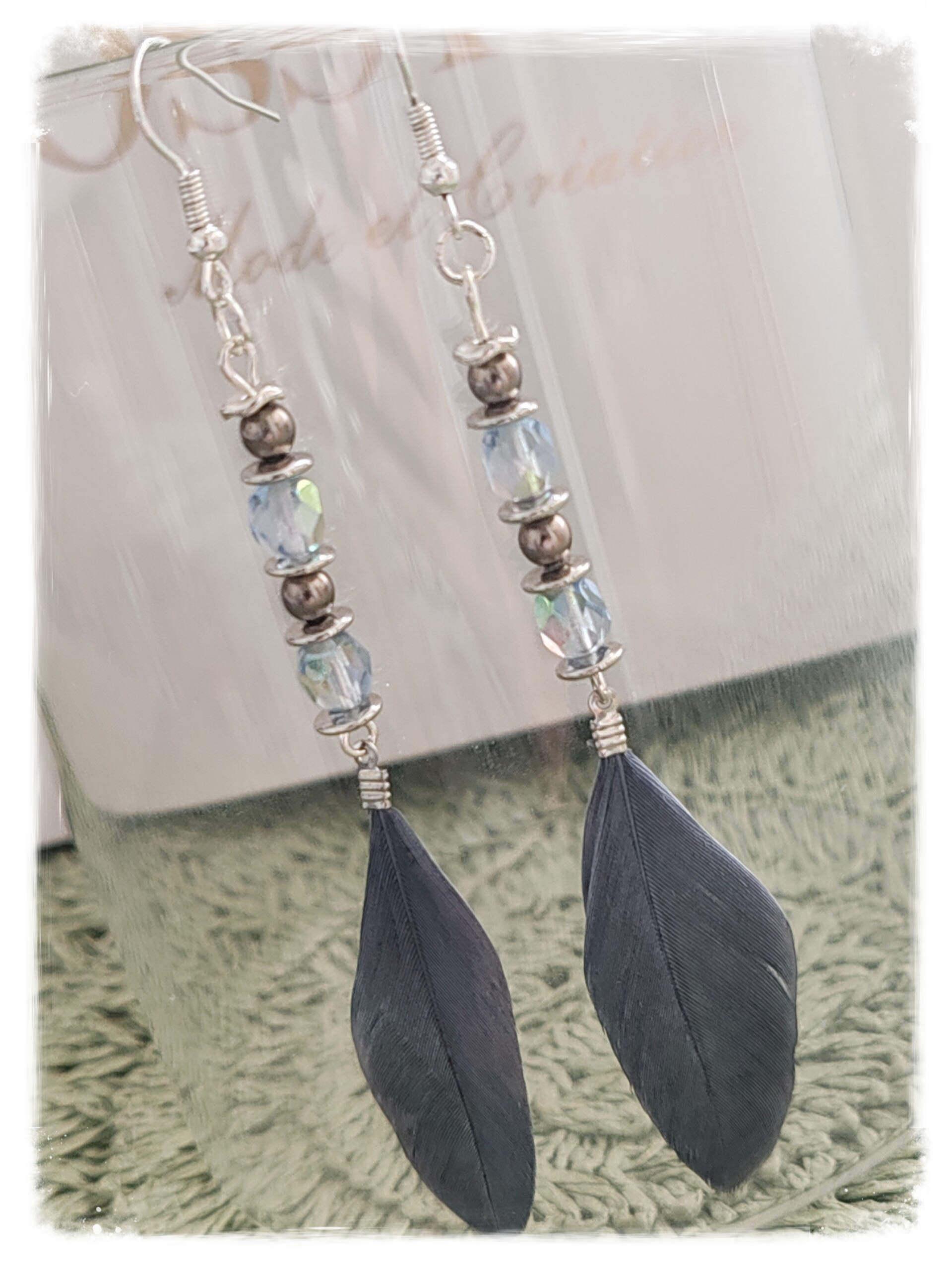 Perle facetté bleu, intercalaire, plume bleu,en acier inoxydable et acier.
