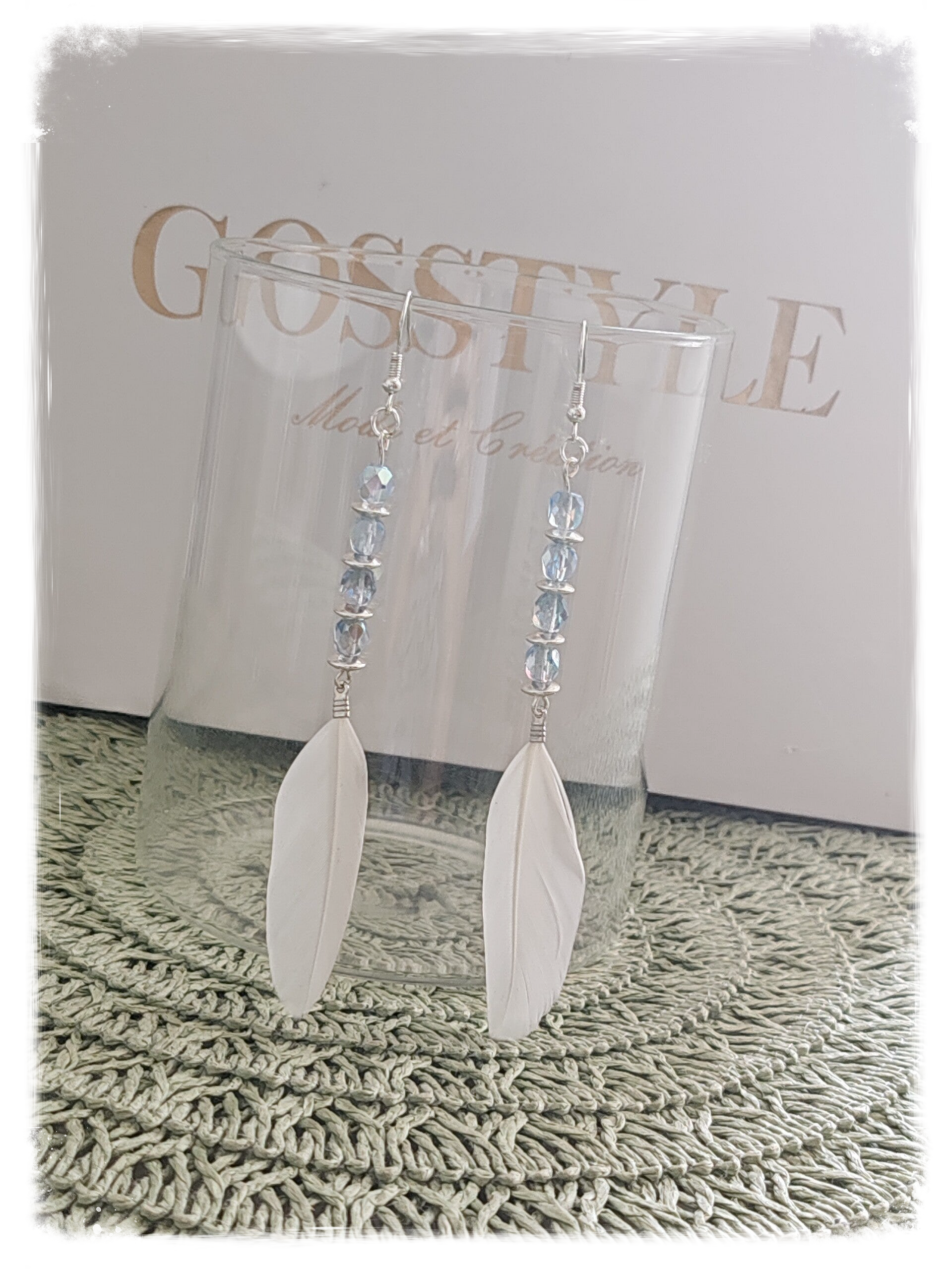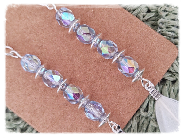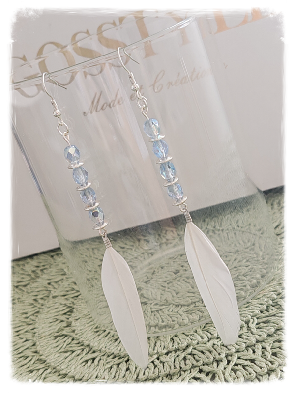 Perle facetté bleu, intercalaire, plume blanche, en acier inoxydable et acier.