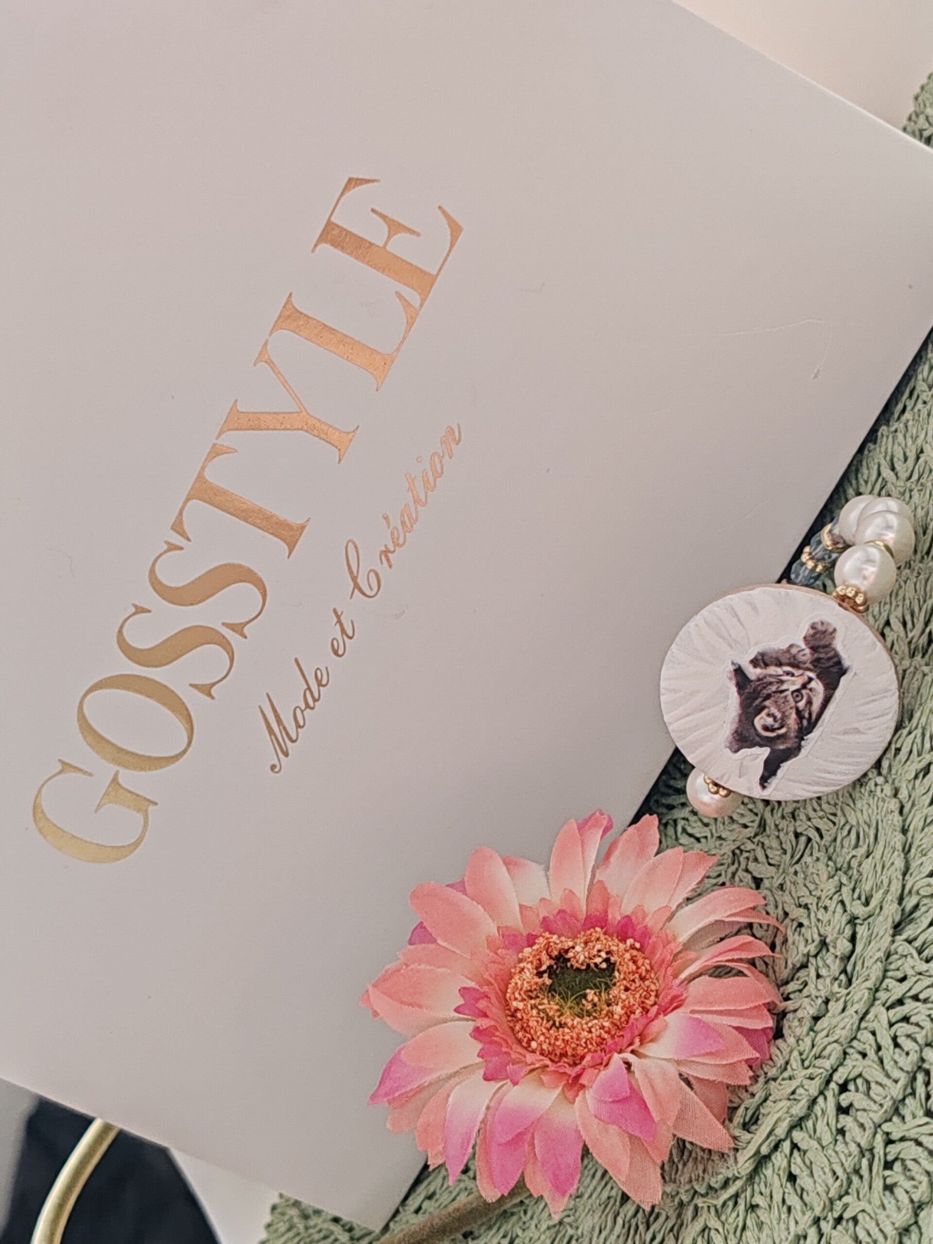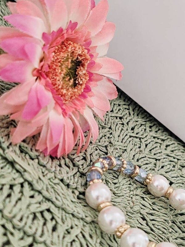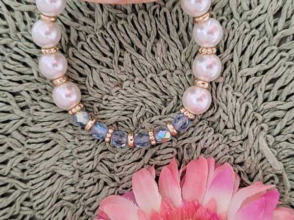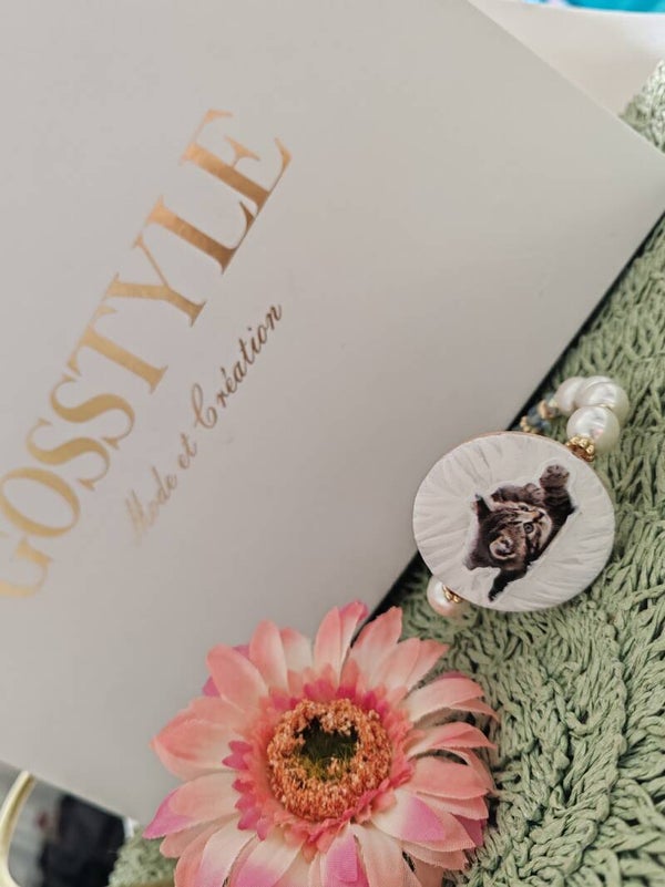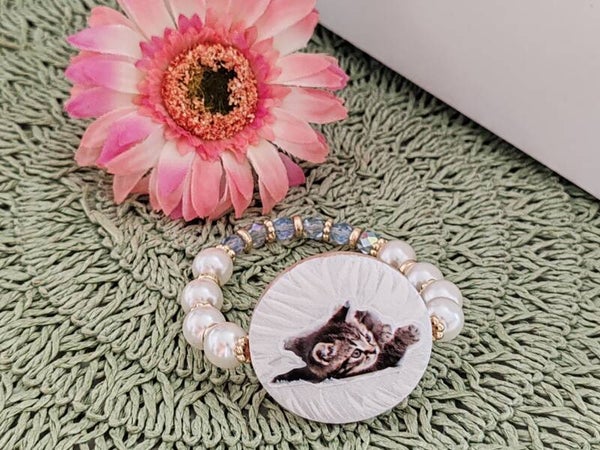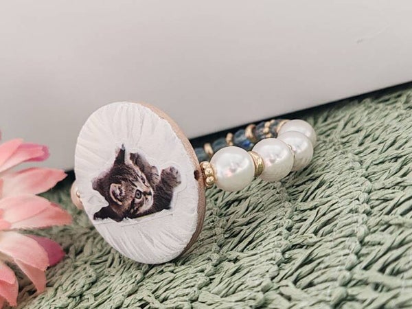 Bracelet 20 cm, perle en verre renaissance blanche, perle facettée bleu, intercalaire, bois, chat + peinture blanche, élastique. P0