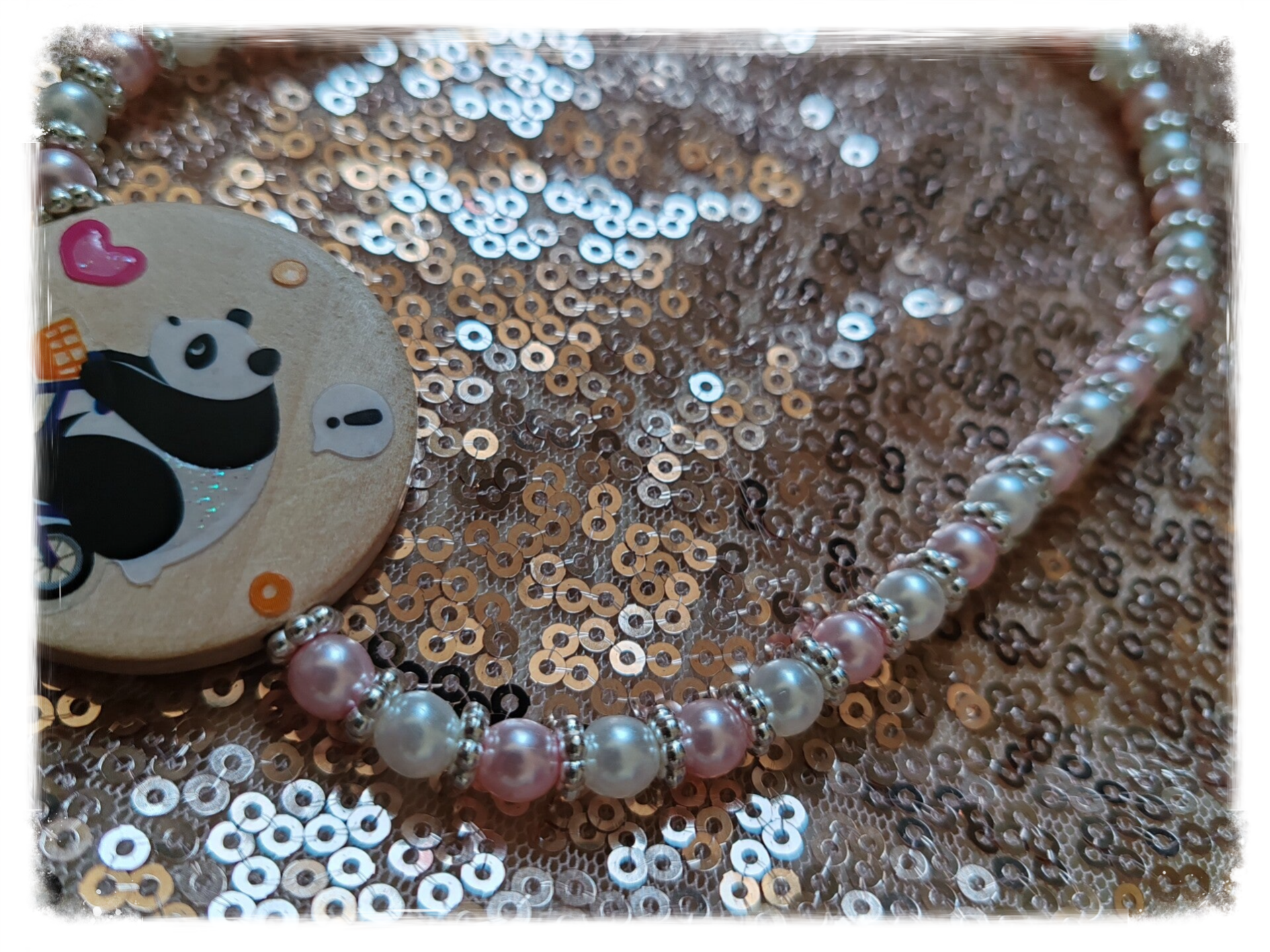 Collier panda, 35 cm, petite perle renaissance en verre rose et blanche, intercalaire, bois, panda, élastique.