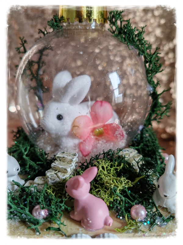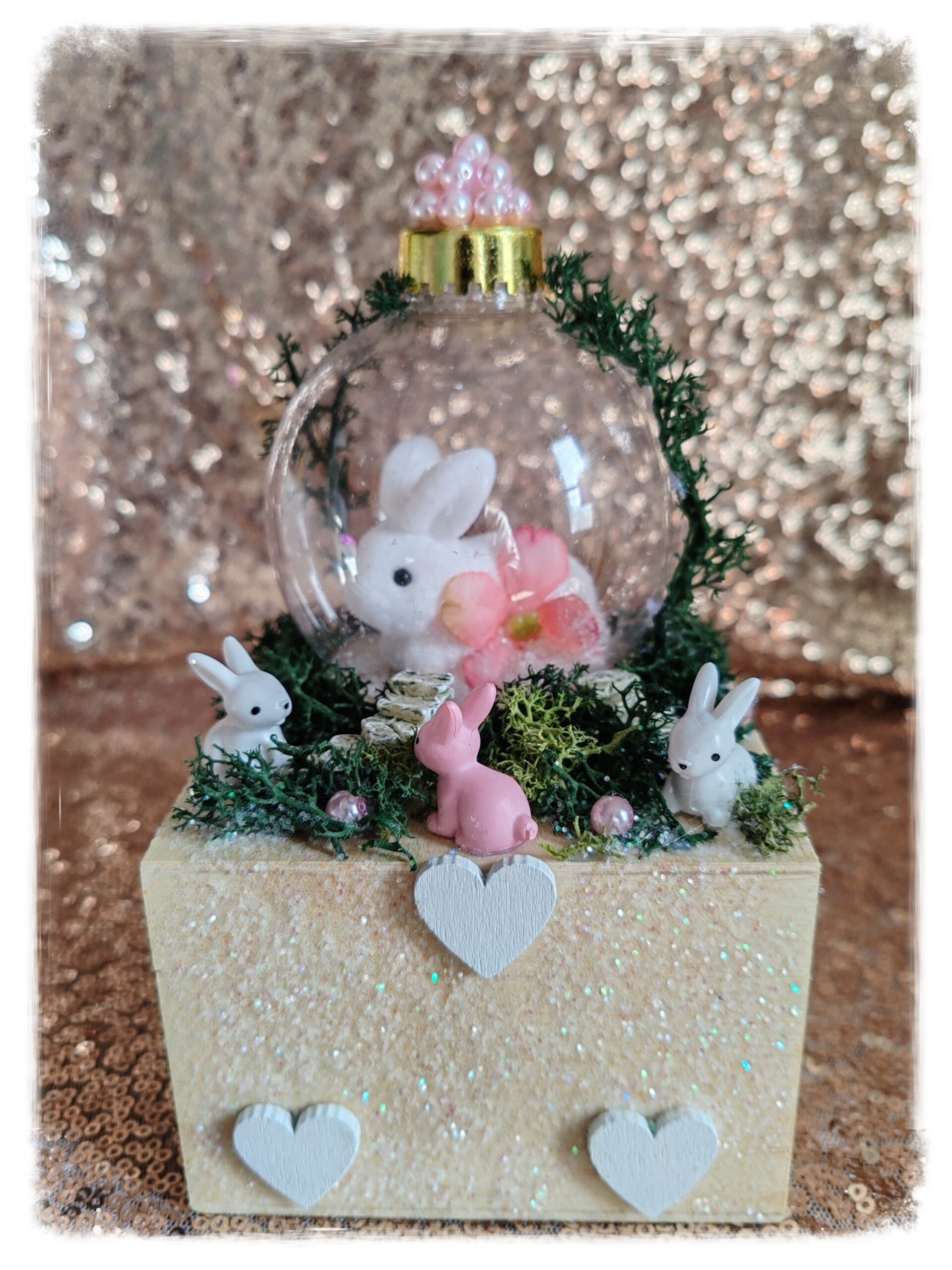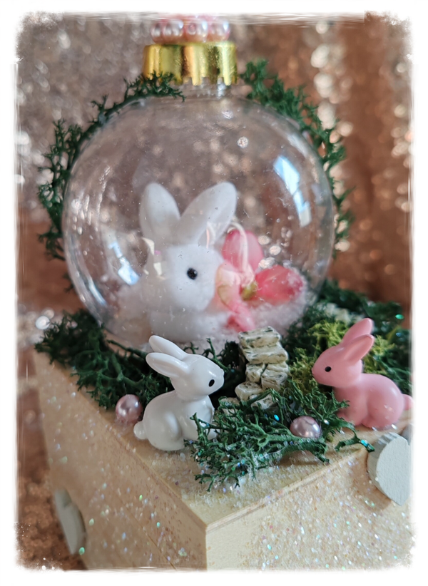 Boîte en bois, longueur:10cm, Largeur: 10cm, hauteur :14cm, boule lapin, petit lapin blanc et rose en résine, cœur en bois blanc, paillette blanche.