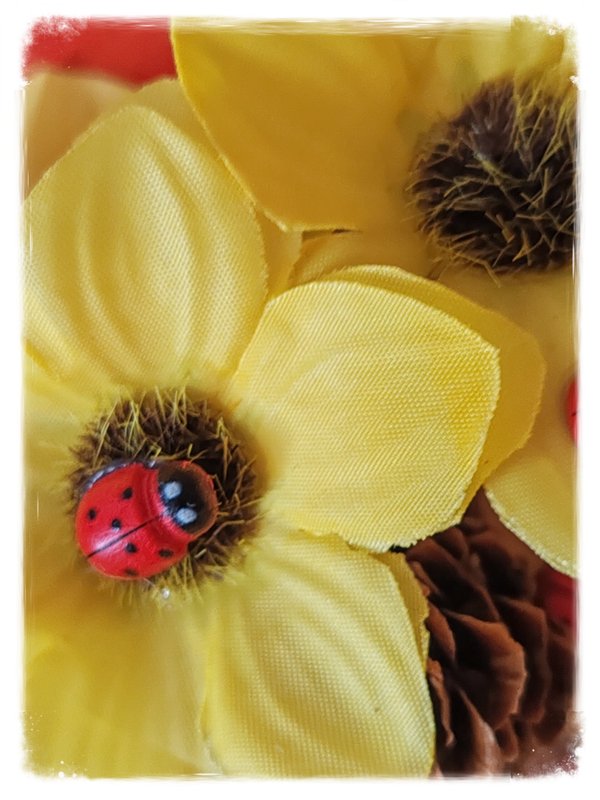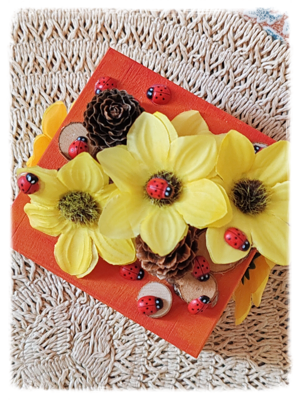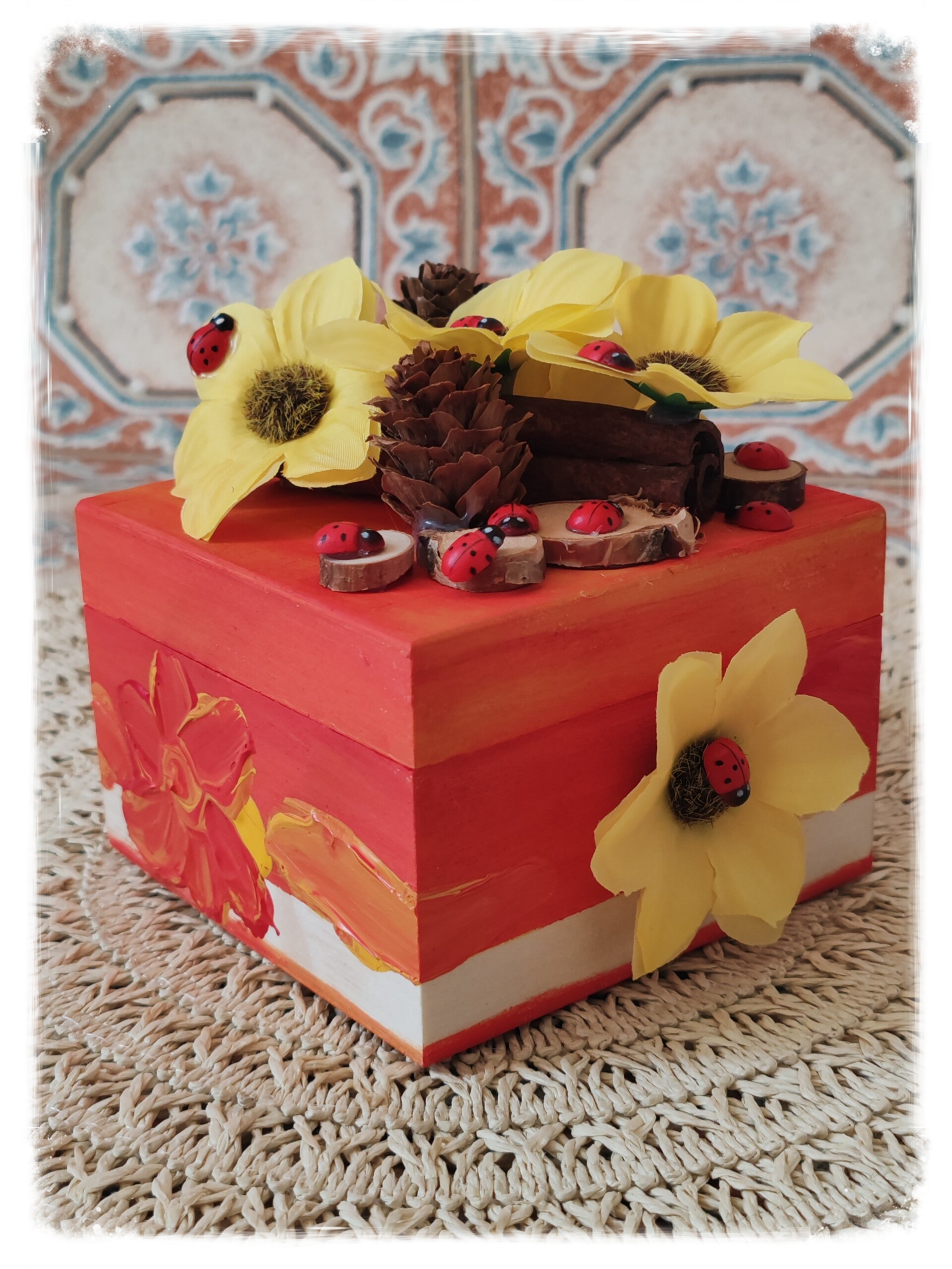 Boîte en bois, longueur 10cm, Largeur :10 cm, hauteur : 11 cm, coccinelle en bois, fleurs artificielles, pomme de pin, cannelle, tronc en bois, peinte à la main. Modèle unique.