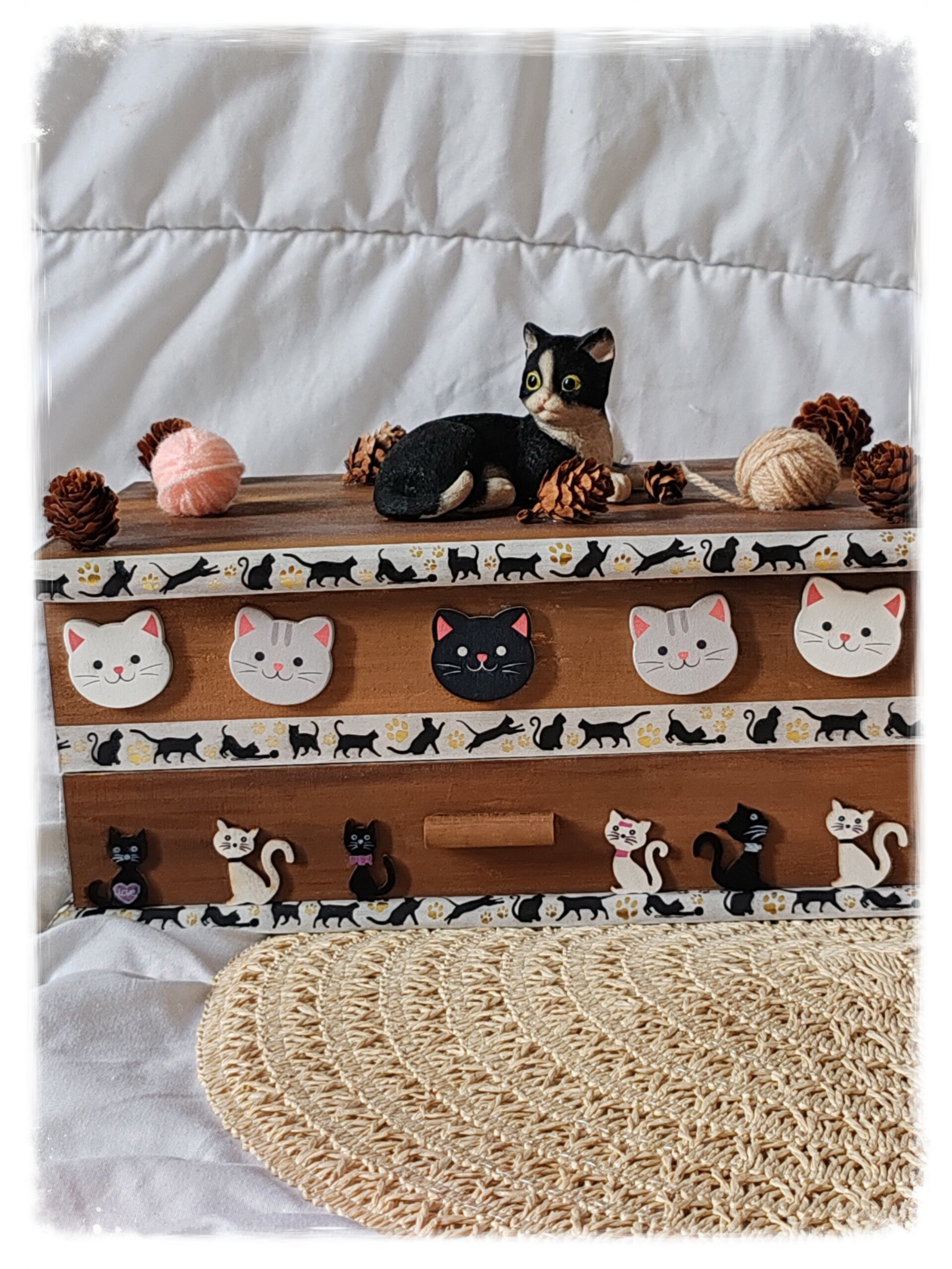 Boîte en bois, longueur :29cm, Largeur :17,5, hauteur :18 cm, chat en céramique, pomme de pin, belote de laine, déco en bois, peint à la main. Modèle unique
