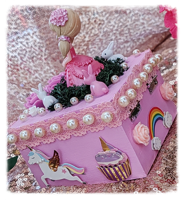 Boîte à bijoux en bois aimanté , rose en résine, princesse en résine, perles en verre renaissance,lapin en résine, couleur écru stickers licorne 3D,peinte à la main, peinture acrylique rose. Longueur 10cm, Largeur 10cm, hauteur 13 cm