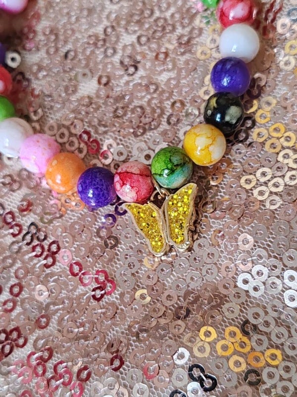 Parure collier +bracelet, jolie petite perle multicolore, papillon couleur vert et jaune, élastique, idéal 5/7ANS.
