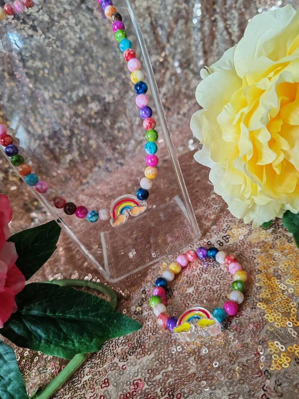 Parure collier + bracelet, jolie petite perle multicolore, arc-en-ciel en plastique, jaune et rose pâle, élastique.ideal 5/7ANS.