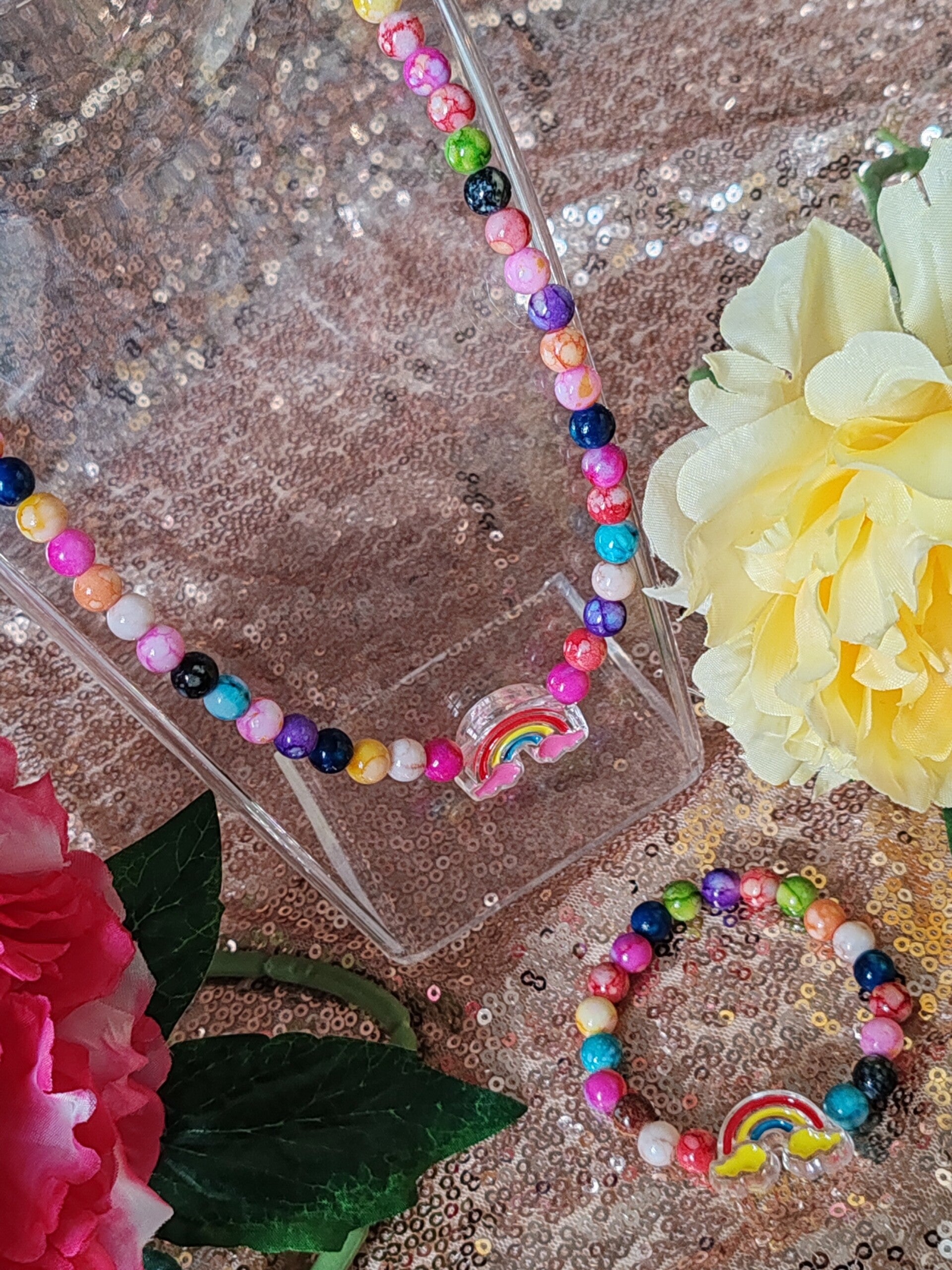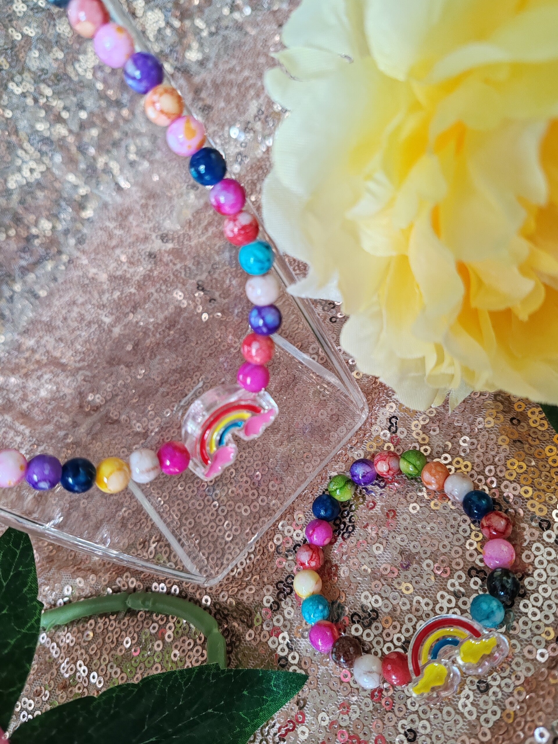 Parure collier +bracelet, jolie petite perles multicolores, arc-en-ciel en plastique, jaune et rose, élastique. Idéal 5/7ANS.