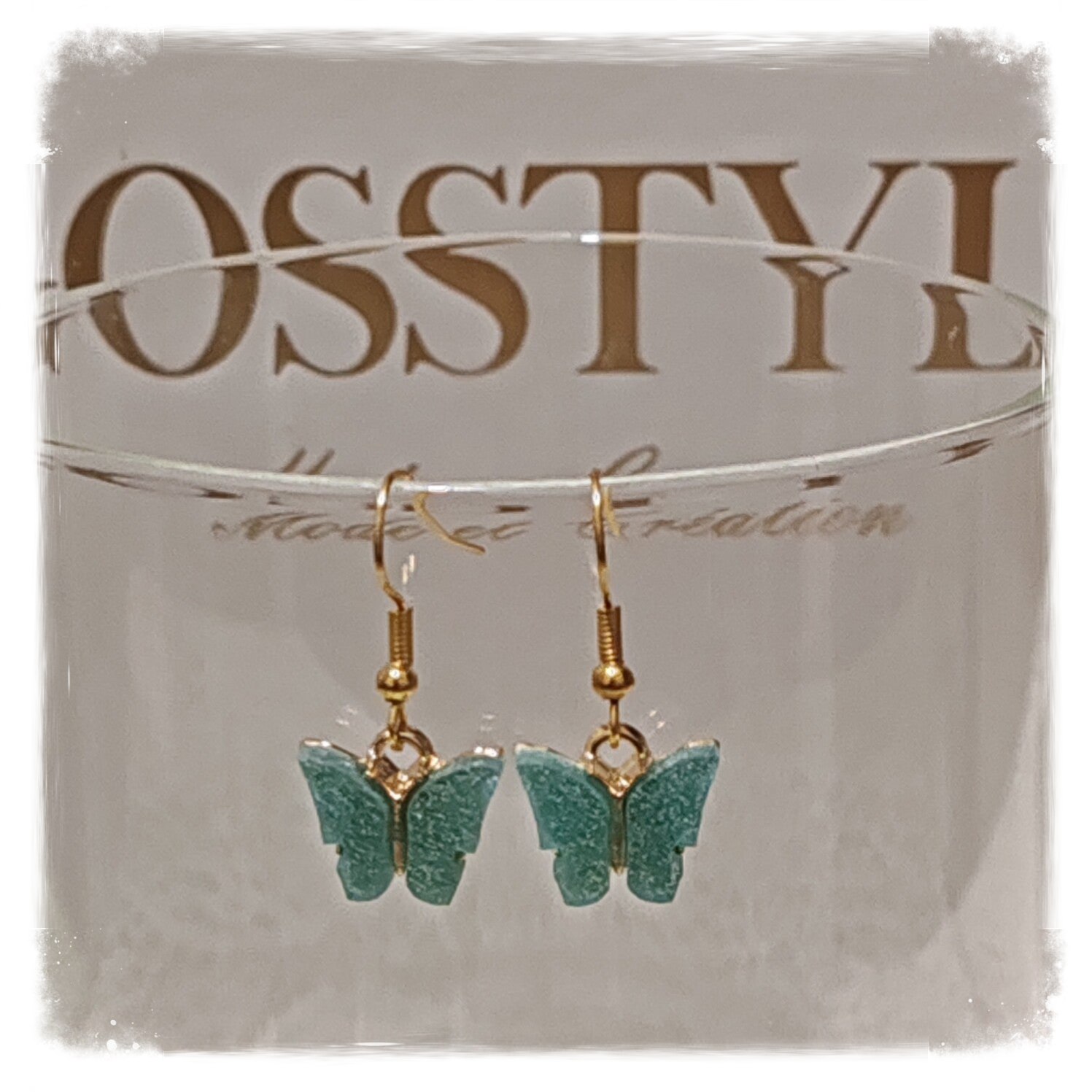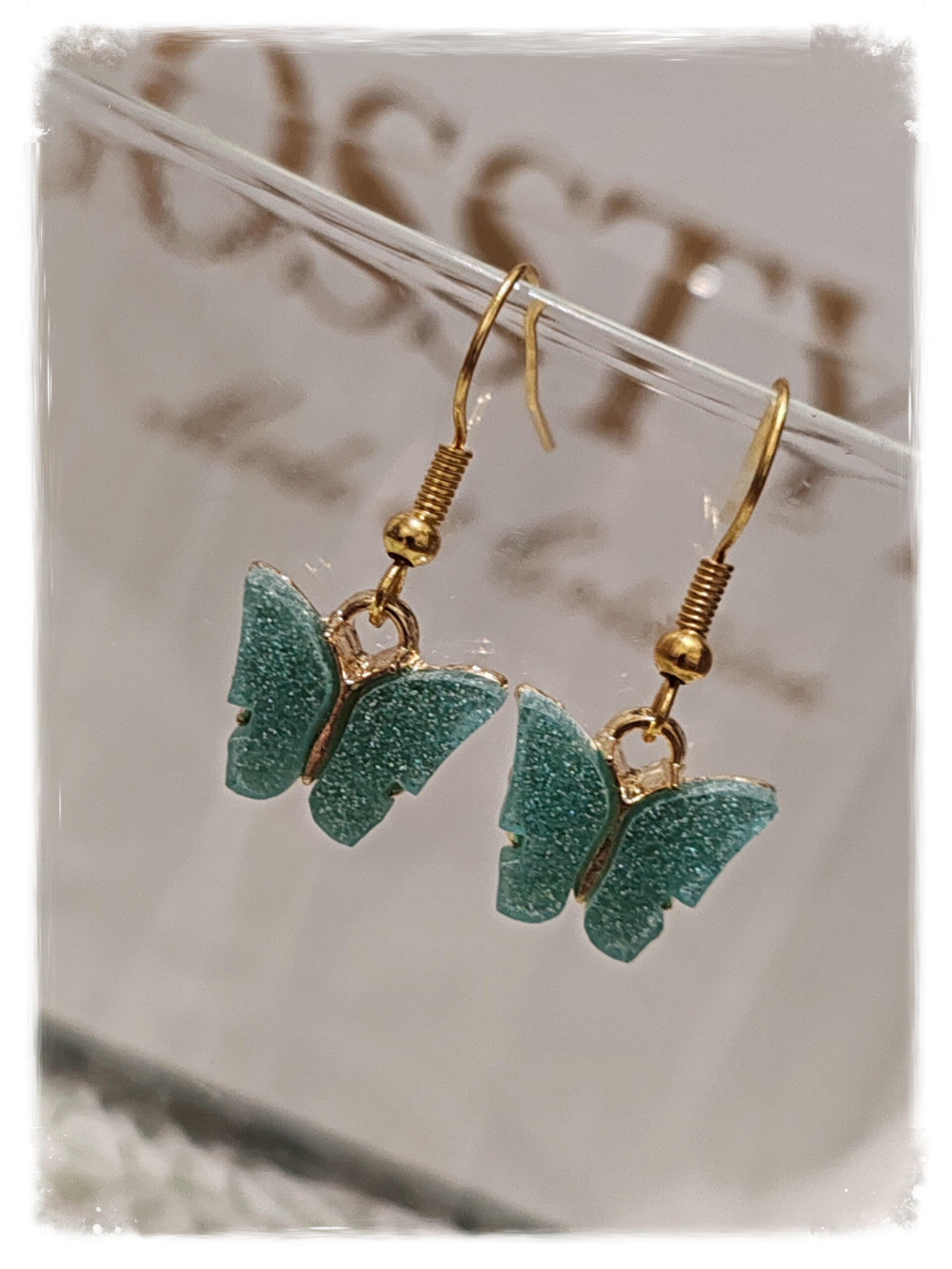Boucle d'oreille en acier inoxydable, papillon couleur vert pailleté.