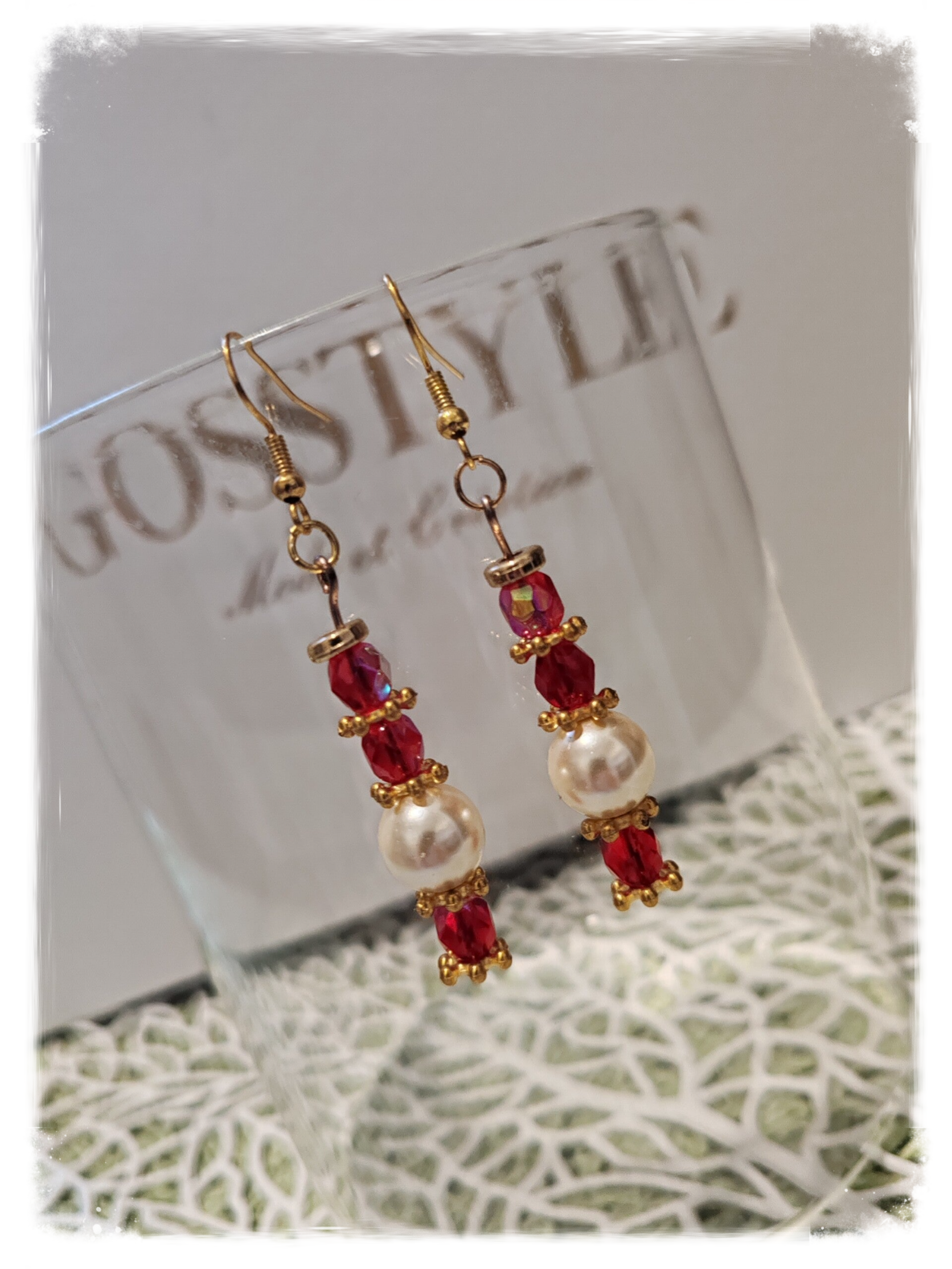 Boucle d'oreille en acier inoxydable, perle facetté rouge, intercalaire, gosse perle en verre renaissance blanche.