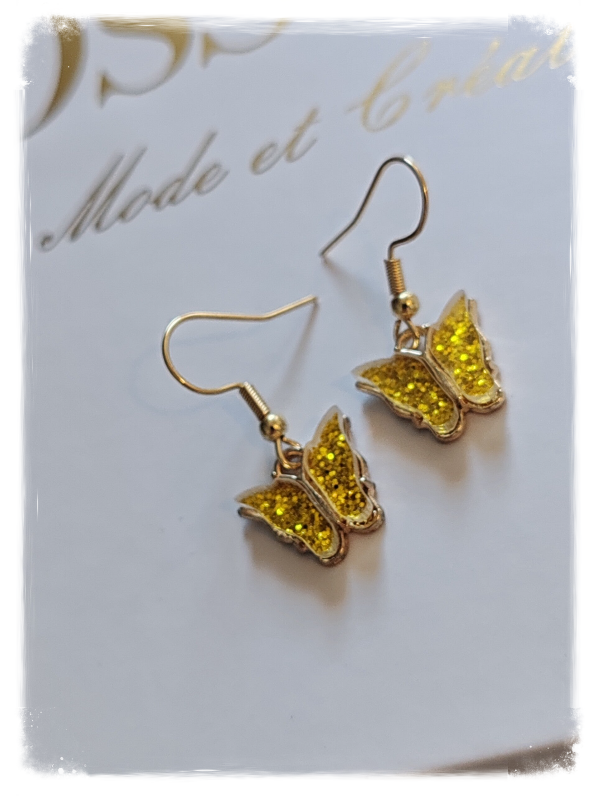 Boucle d'oreille en acier inoxydable, papillon jaune or pailleté