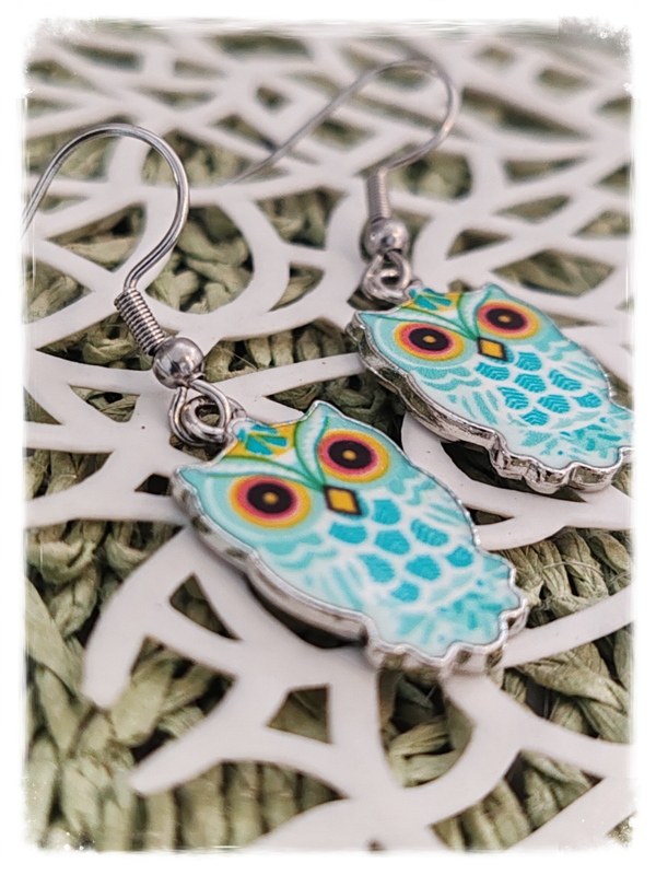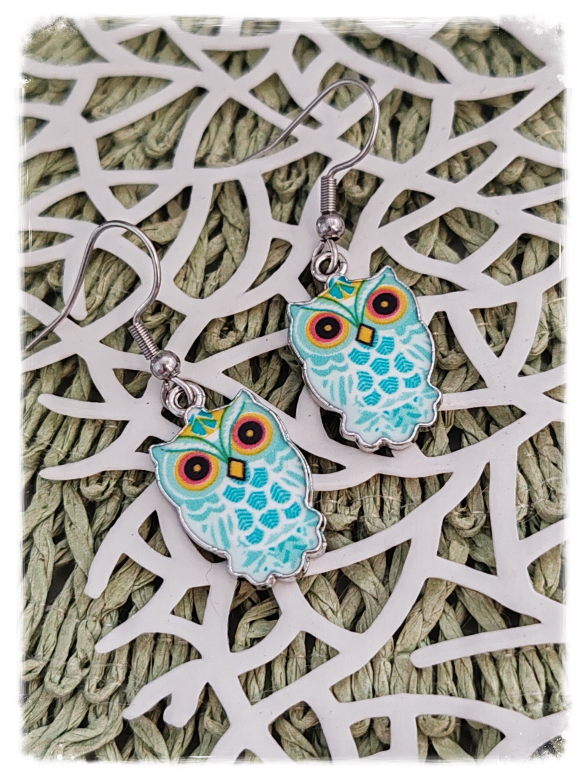 Boucle d'oreille en acier inoxydable, hiboux en alliage bleu turquoise