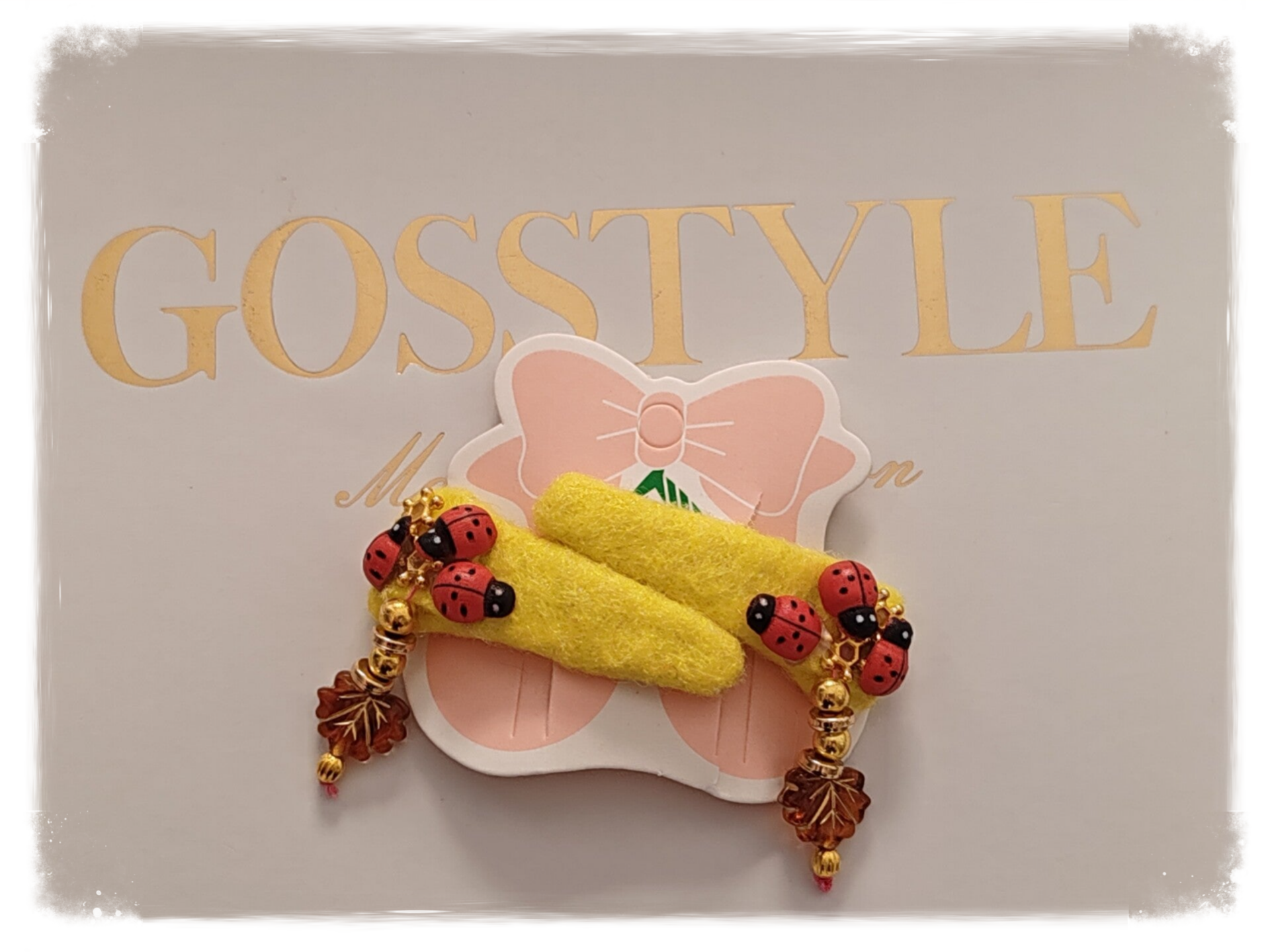 Barrettes à cheveux, 5,5 sur 1,5 cm, feutrine jaune, coccinelle en bois, intercalaire, feuille perle