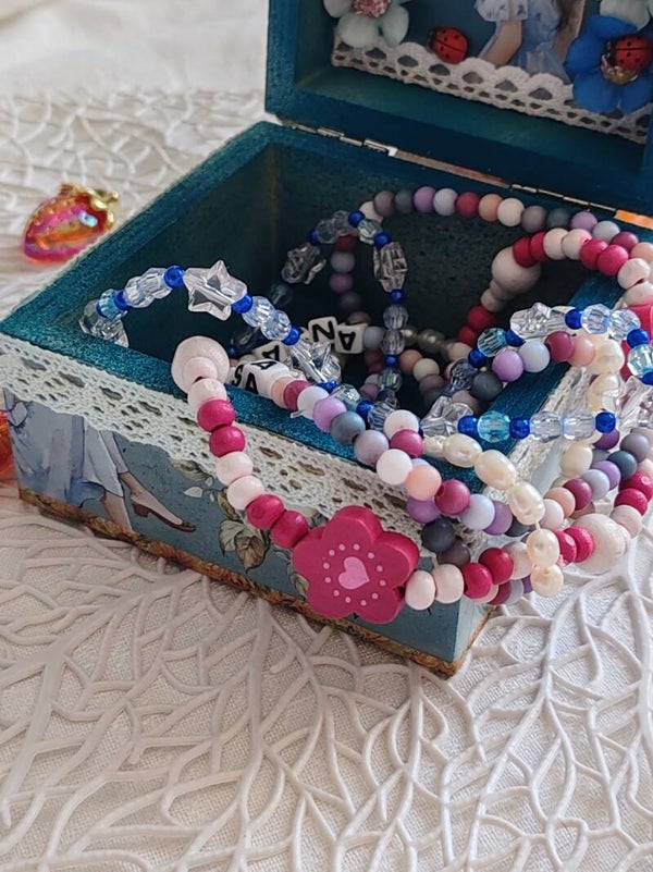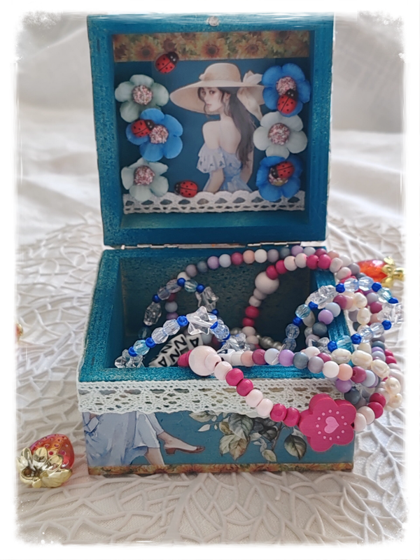 Boîte à bijoux en bois aimanté, peinture acrylique bleu en spray, coccinelles en bois, strass rouleau autocollant personnage,coccinelles en bois, dentelle, fleur en tissus.largeur 10cm, longueur 10cm, hauteur 13 cm.