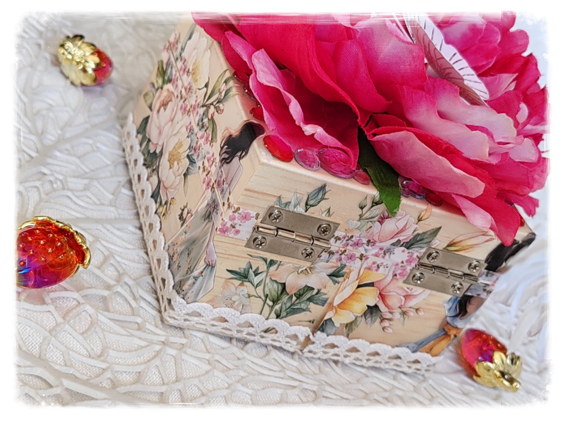 Boîte à bijoux en bois aimanté, perle en verre renaissance blanche et rose, fleur en tissus rose, ruban Autocollant transparent personnage, dentelle, papillons blanc, strass. Largeur 10cm, longueur 10cm, hauteur 13 cm.