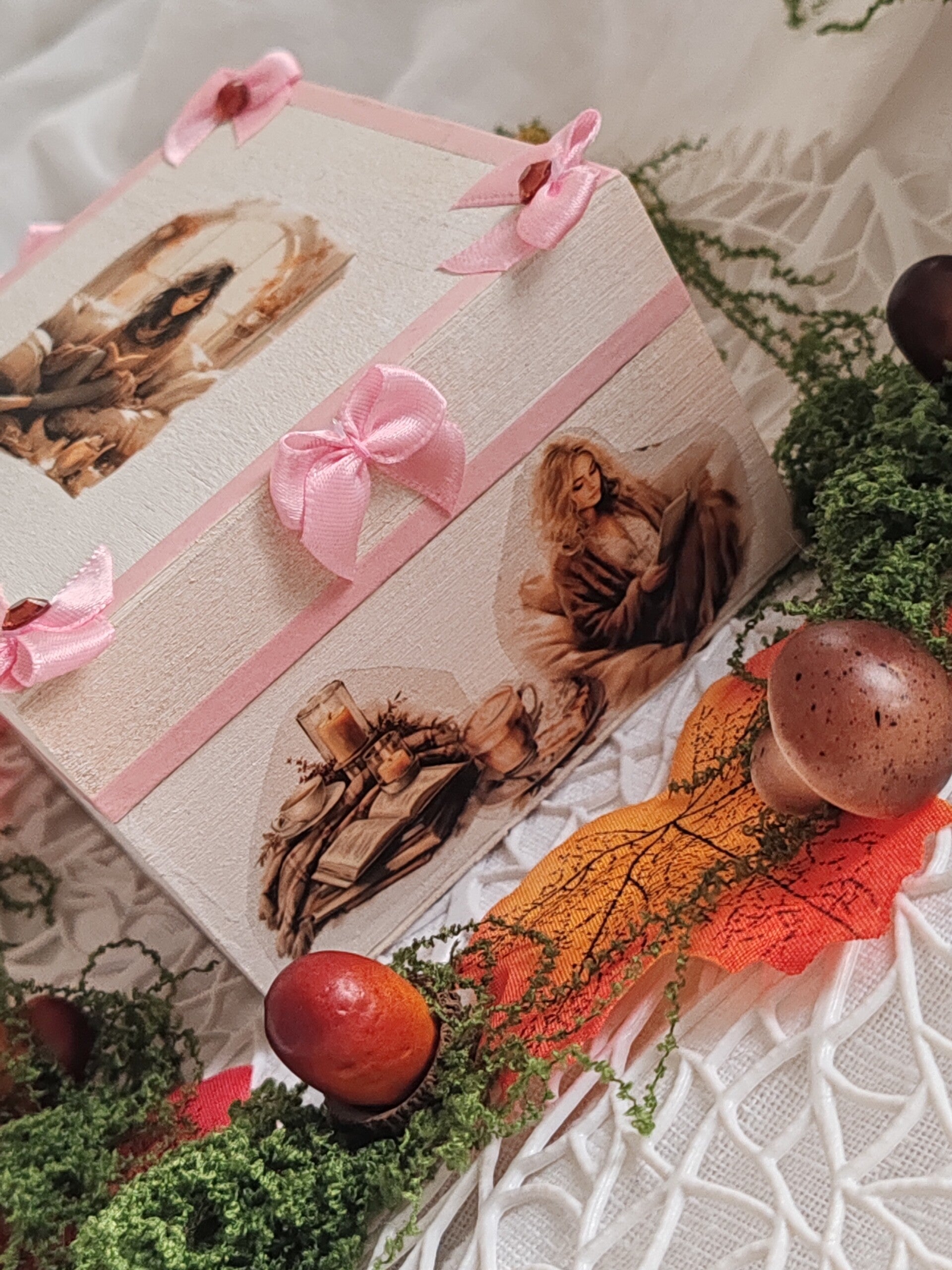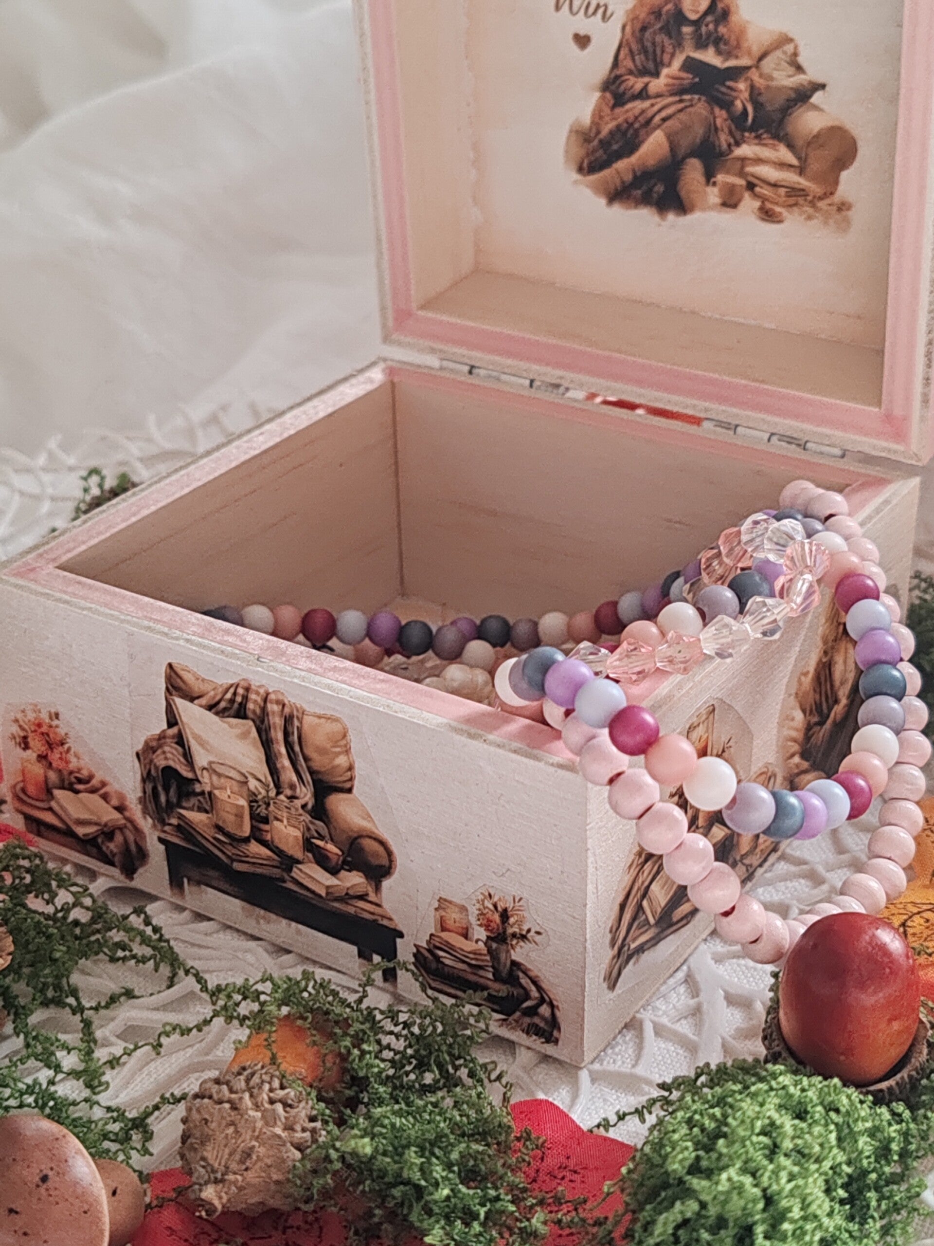 Jolie Boîte à bijoux en bois aimanté, peinture blanche acrylique en spray, nœuds roses, ruban rose adhésif , personnage adhésif. Verni de protection en pray.