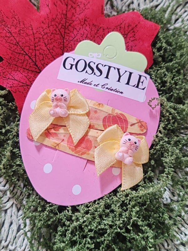 Barrettes feuille et citrouille D'automne nœud jaune et son chat beige